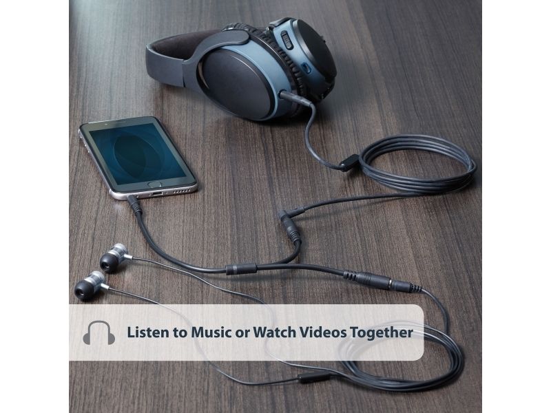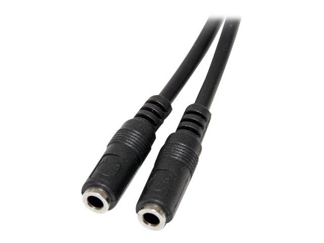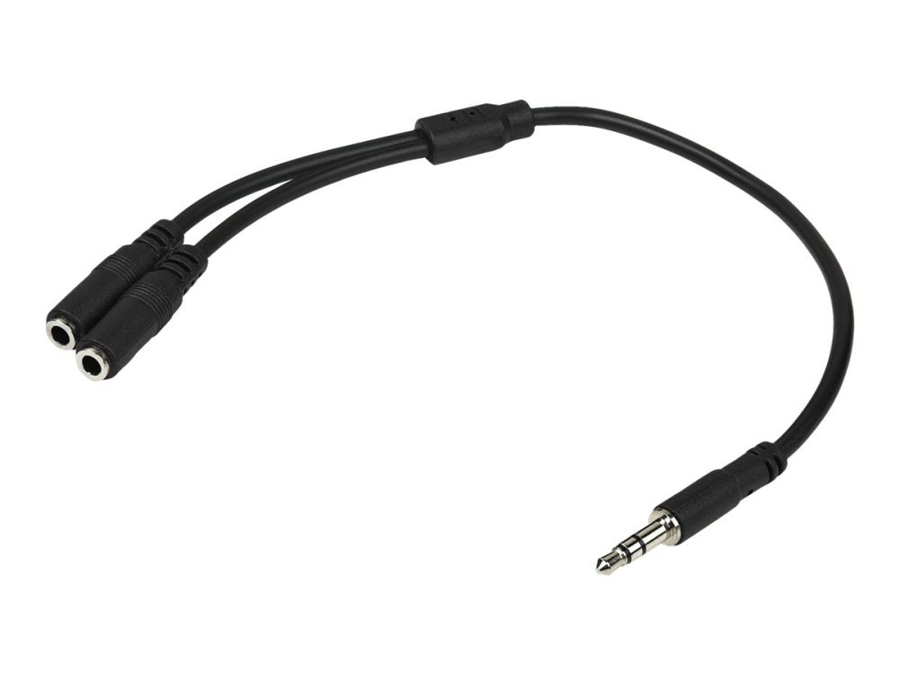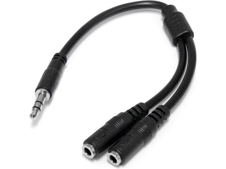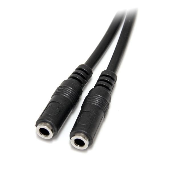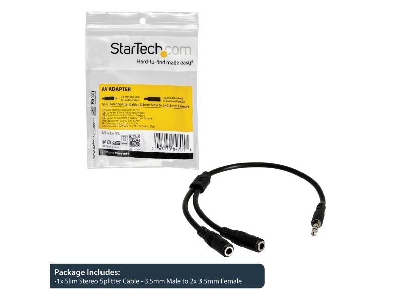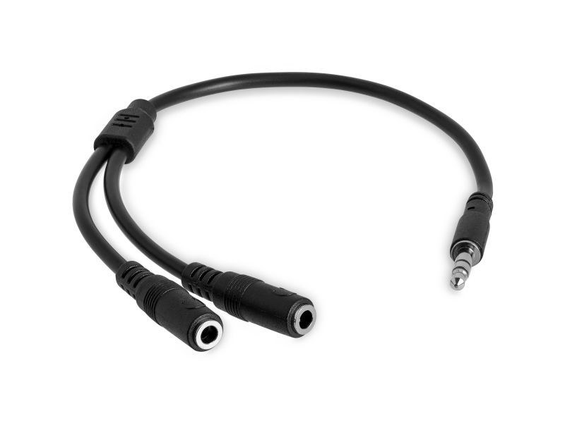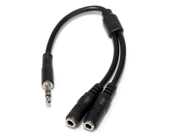 Split one headphone jack into two separate jacks. The MUY1MFFS Slim 3.5mm Stereo Splitter Cable/Y-cable features one 3.5mm male and two 3.5mm female audio connectors, splitting a single headphone jack into two.