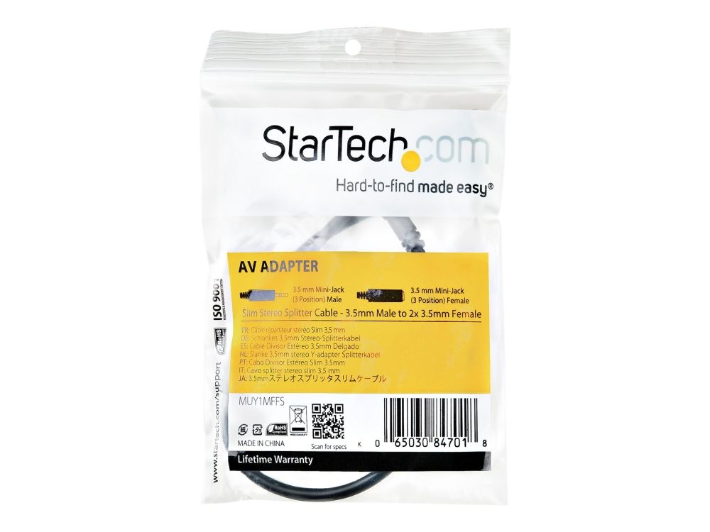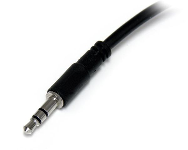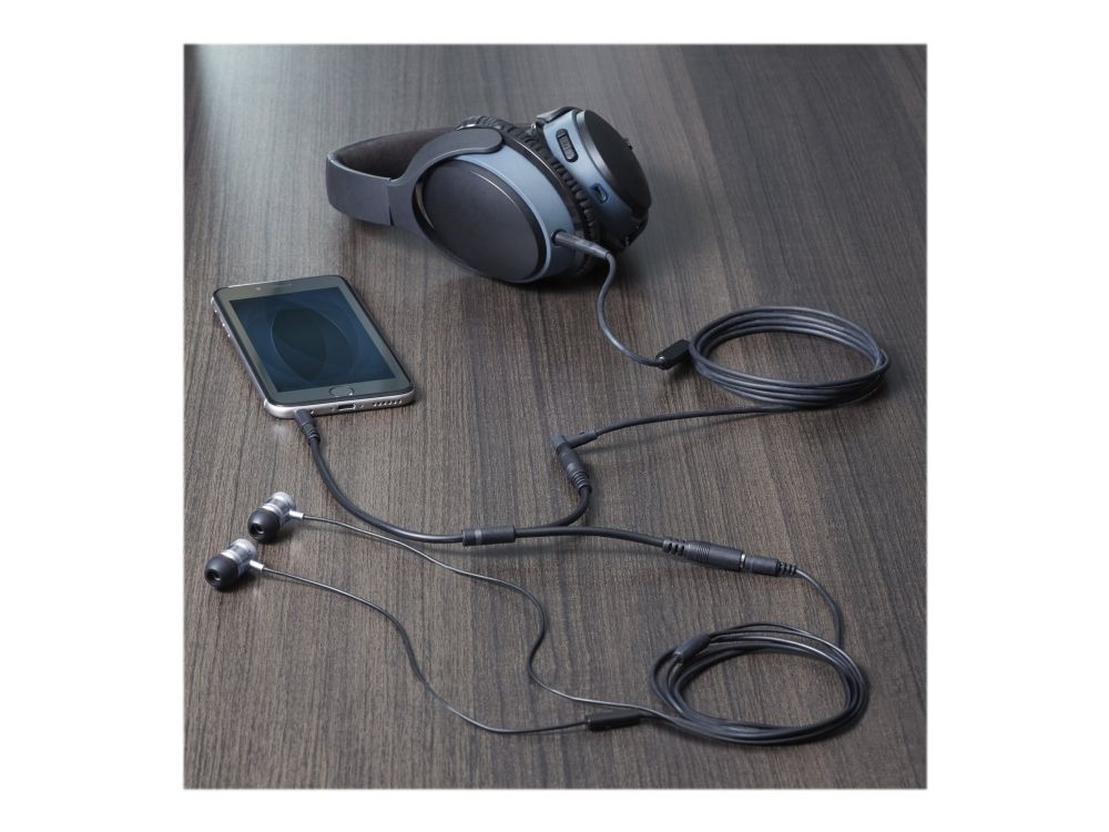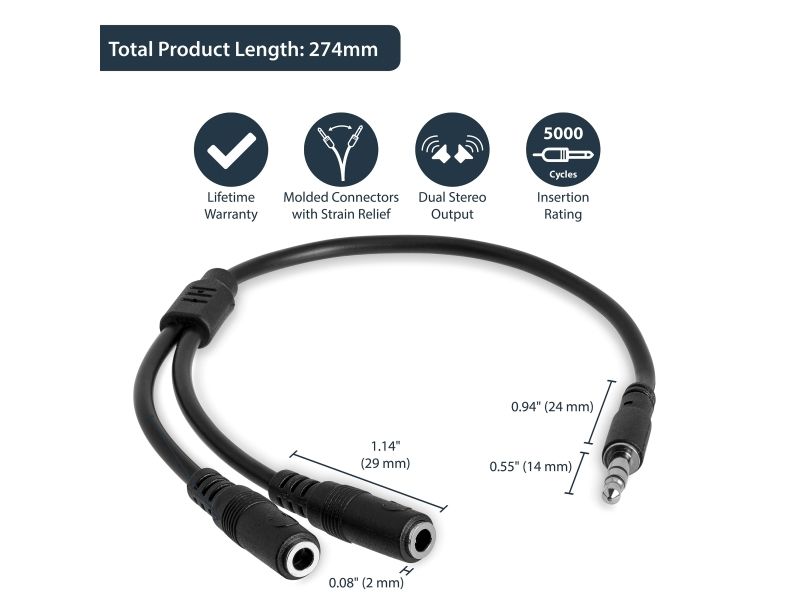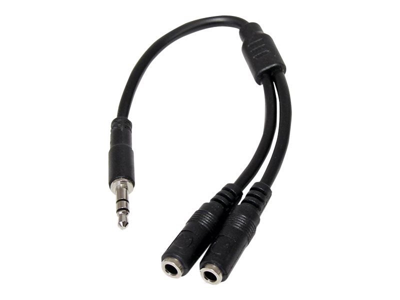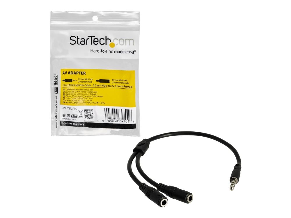Split one headphone jack into two separate jacks. The MUY1MFFS Slim 3.5mm Stereo Splitter Cable/Y-cable features one 3.5mm male and two 3.5mm female audio connectors, splitting a single headphone jack into two.