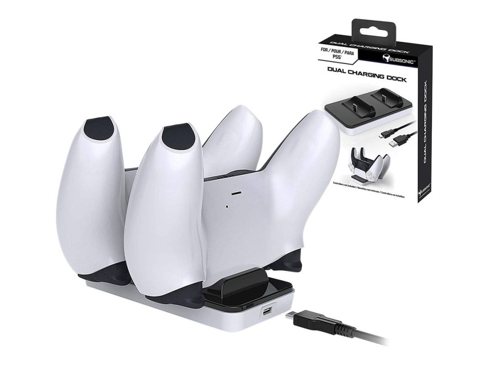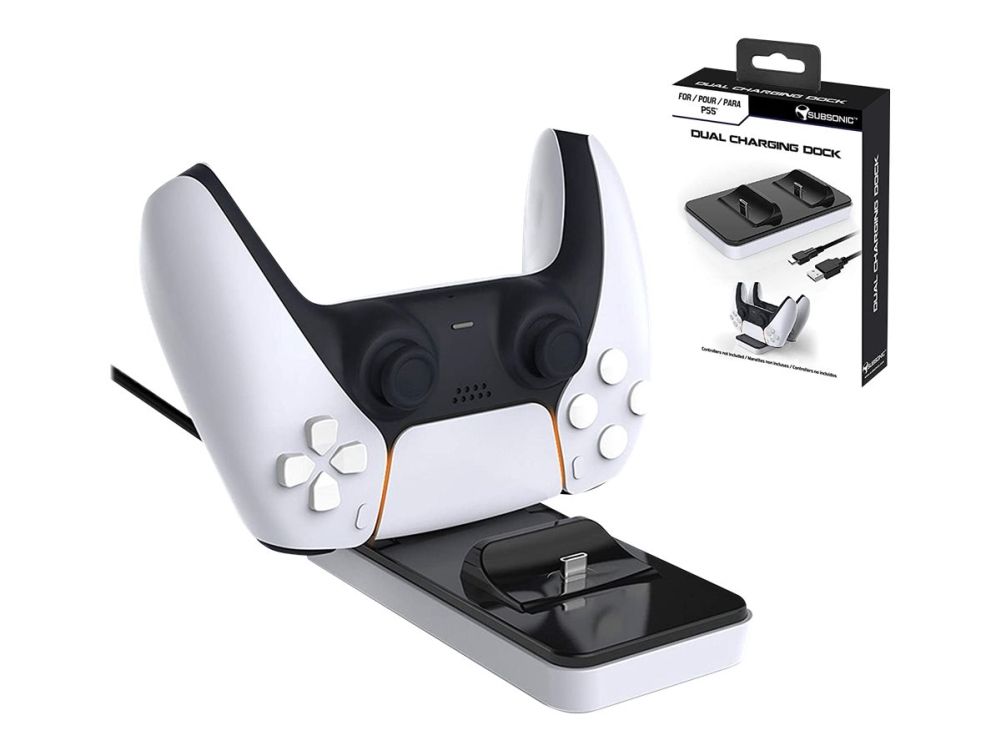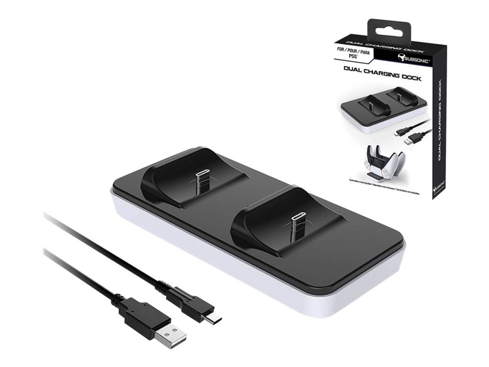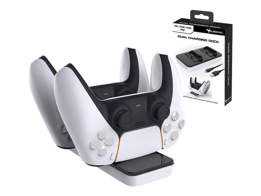 Charging and storage base for 2 PlayStation 5 Dual Sense controllers.