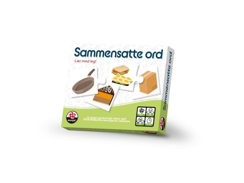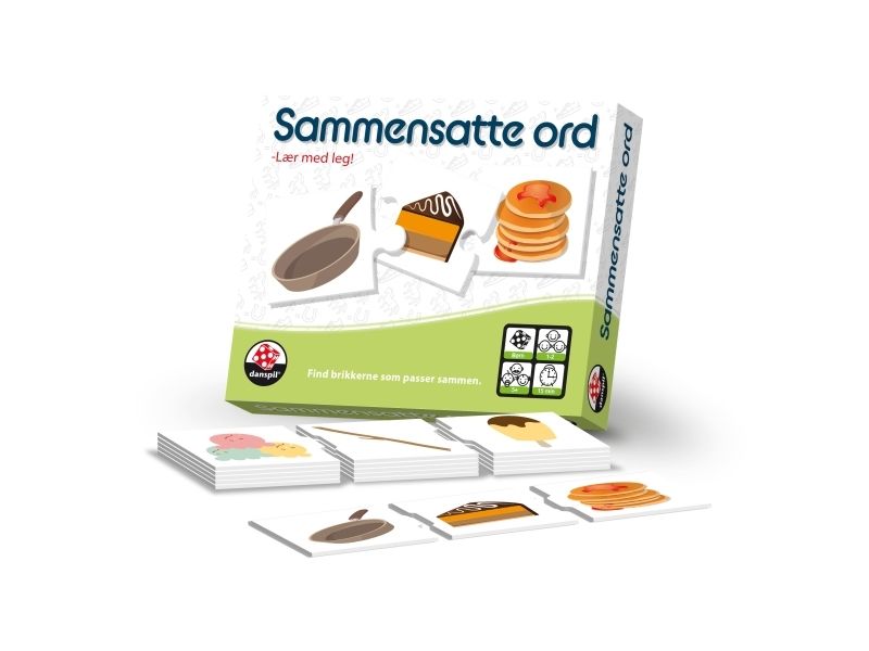 Match the words so that two words become a third word. From 4 years. Learn as you play is a series of games where children learn through play. The games are a fun and safe way for preschool children to get to know the numbers and letters and they help develop their logic sense and ability to concentrate. Get the pieces to match so that two words form a third word, like Sol + Briller become Solbriller and Pande + Kage become Pandekage. The game also trains children's combination skills. For 1-2 players. Playing time 15 min. From 4 years.