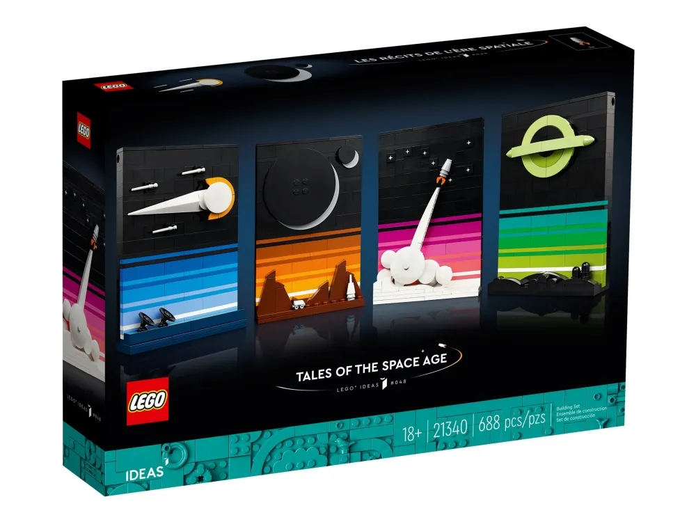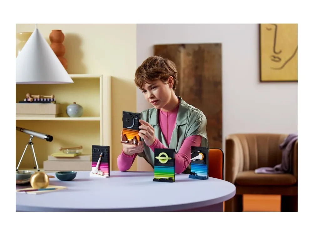 LEGO® Ideas Geschichten aus dem Weltraumzeitalter (21340) ist genau das richtige Bauset, um dich deine Nachbrenner abschalten und dich durchs Weltall schweben zu lassen. Das Set beinhaltet 4 zusammenfügbare 3D-Postkarten mit Motiven, denen Science-Fiction-Mythen, Filme, Bücher und Poster aus den 1980er-Jahren als Vorbild dienten. Erschaffe ebenso coole wie minimalistische Darstellungen einer Sternwarte, einer Mondbasis und einer Mondfinsternis, eines Spaceshuttles im Weltall und eines schwarzenLochs – aus LEGO Steinen.