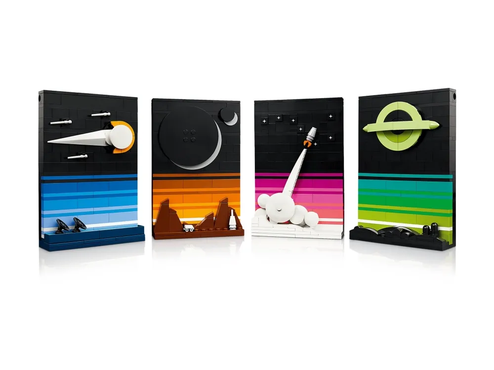4 zusammenfügbare 3D-Postkarten mit Weltraummotiven (21340): Erzähle mit diesen baubaren Postkarten Geschichten aus dem Weltraumzeitalter im LEGO® Stil. Die Motive basieren auf Science-Fiction-Mythen, Filmen, Büchern und Postern aus den 1980ern