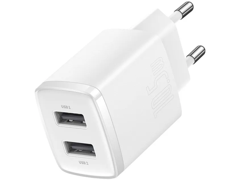 Brand- Baseus. Model- Compact Charger 2U. Compatible phone models- All. Length- 10 cm. Power- 10.5 W. Colour- White. Input voltage- 100 - 240V. Connections- 2 x USB. Mandatory warranty- 24 mo. Warranty for legal entities- 12 mo.
