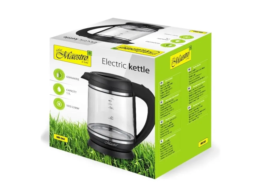 Feel-Maestro MR060. Water tank capacity: 1.7 L. Power: 2200 W. Product colour: Black, Transparent, Housing material: Glass, Adjustable thermostat, Water level indicator, Overheat protection