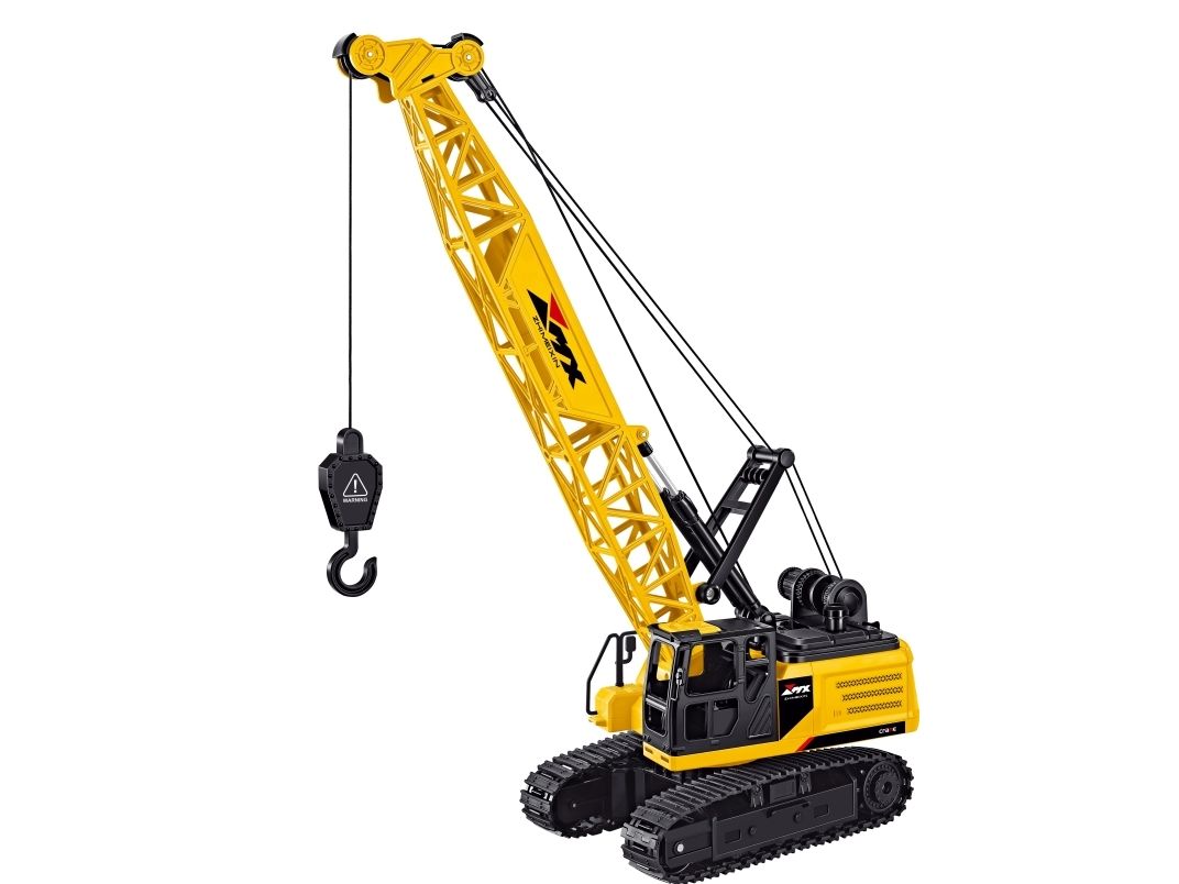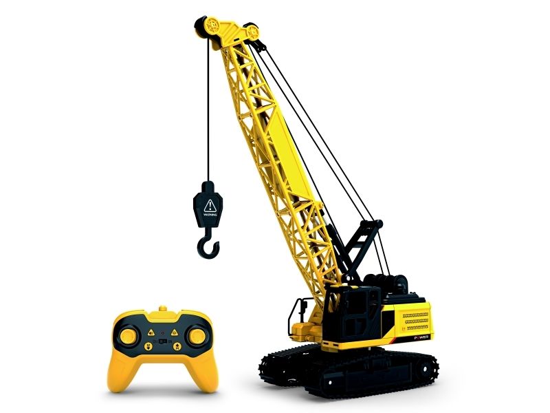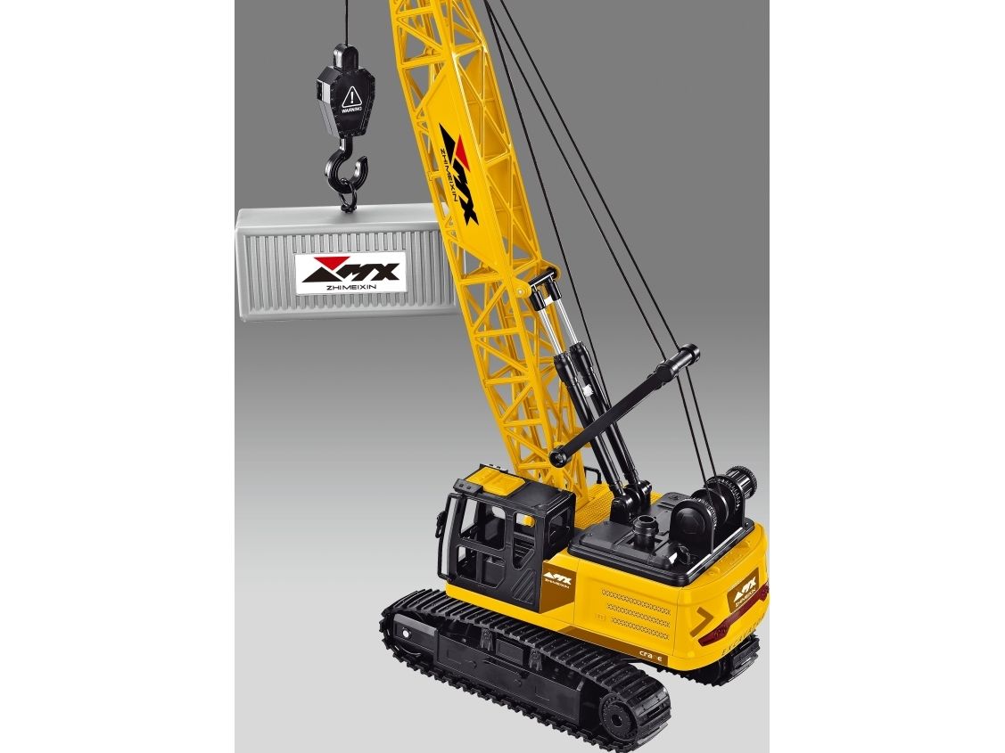 Functions: Remote control crane (8-way control). Drives forward, backwards, left and right turns. Real Caterpillar tracks Sound effects Flashing rear lights Manual rotating of workbench Manual adjustments of Crane arm angle Metal Hydraulic Cylinders Real Pulleys RC operated Solid hook for lifting and lowering materials or containers. Playing time: 20-25 minutes Remote control distance: 30-40 meter Battery charging time: 90-120 minutes 2,4 GHz frequency