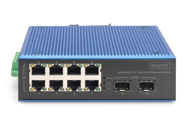 The DIGITUS DN-651146 is designed for robust industrial networking applications. It operates efficiently within a wide temperature range of -40°C to 80°C and can handle humidity levels from 5% to 95%. This switch features 8 Fast Ethernet ports alongside 2 Gigabit SFP ports, ensuring flexibility and high-speed connectivity. Built for durability, it boasts a metal housing and is IP40 compliant, providing protection against dust and particles in demanding environments. With a MTBF of 300,000 hours, it is engineered for reliability.