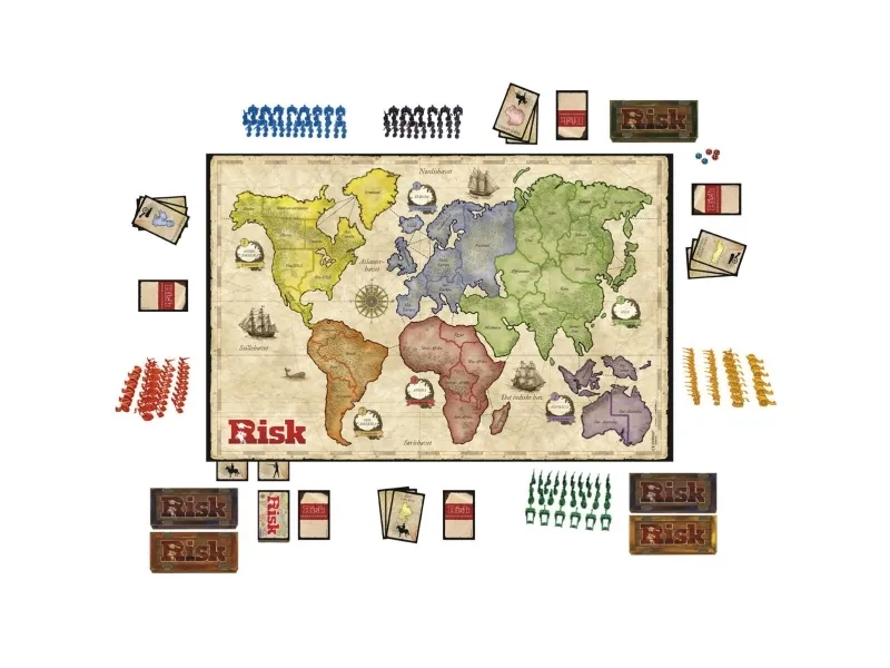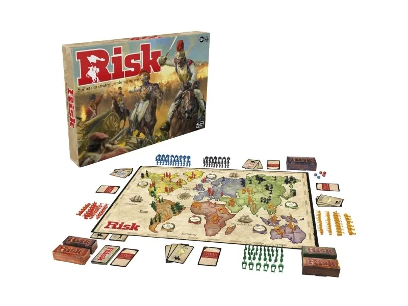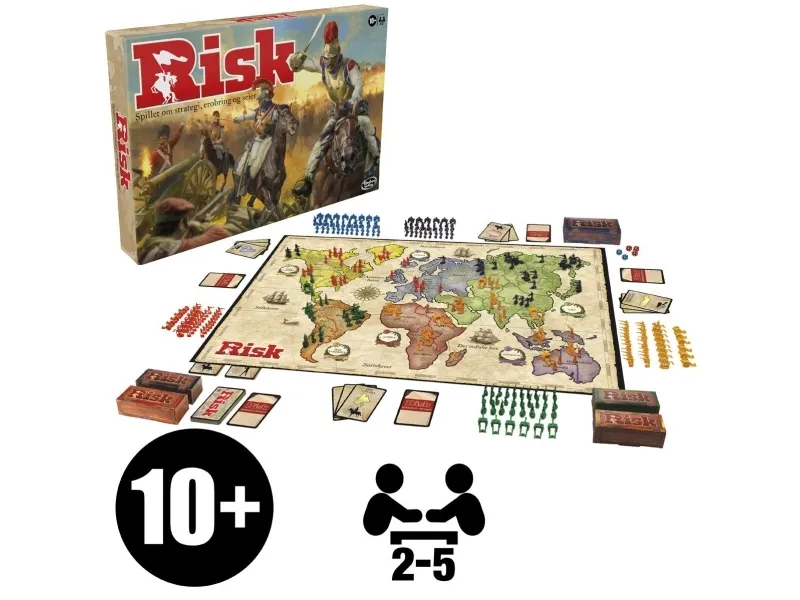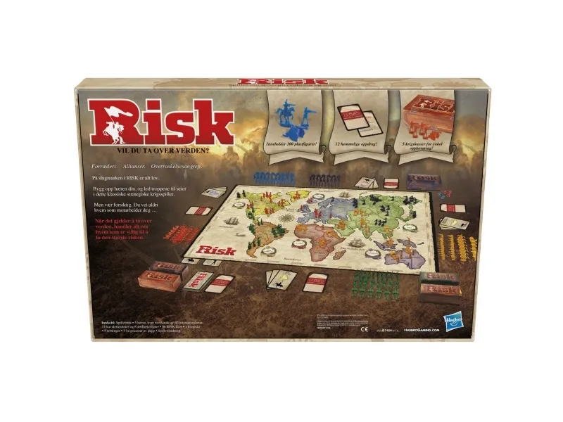 Wer erobert die Welt? Wenn sich 2-5 Spieler ab 10 Jahren einen strategischen Kampf auf dem Spielbrett liefern, ist RISIKO angesagt. Diese Auflage des unangefochtenen Brettspielklassikers versetzt die Spieler in eine Zeit mächtiger Befehlshaber, wagemutiger Feldzüge und erschmetternder Kapitulationen. Mit einem aufwendig gestalteten Spielplan in nostalgischem Look, detailreichen Spielfiguren, geheimen Missionskarten und Kartonkisten als praktische Materiallager ist diese Edition des berühmten Strategiespiels ein Must-have für Retro- und Risiko-Fans. Bei Risiko setzen die Spieler ihre Armeen taktisch klug auf das Spielbrett, um diese Gebiete strategisch geschickt zu besetzen. Doch während sie versuchen, weitere Ländereien zu erobern, sind die gegnerischen Armeen schon in Stellung. Mit Infanterie, Kavallerie und Artillerie marschieren sie ein und greifen an. Eine riskante Schlacht beginnt und da die Kämpfe mit Würfeln ausgefochten werden, weiß niemand, welche unvorhersehbaren Ereignisse eintreffen, und wer am Ende seine Armee zum Sieg führt. In dieser prächtigen Ausgabe erwachen die riskanten Schlachten detailgetreu zum Leben. Der Spielplan erscheint im Look einer altertümlichen Weltkarte und die Spielfiguren (Soldaten, Reiter und Kanonen) in detailreicher Aufmachung. Mit insgesamt 56 Karten - davon 42 Gebietskarten, 2 Jokerkarten und 12 Missionskarten - kann der Kampf um die Weltherrschaft beginnen. Ob die Spieler untereinander Bündnisse eingehen, um gemeinsam gegen einen einzigen Feldherrn anzutreten, oder sie einem Angriff aus dem Hinterhalt entkommen müssen - bei Risiko ist alles möglich. Diese Risiko-Edition beinhaltet 4 Spielvarianten, sodass jeder Risiko-Spieler seinen Favoriten findet. 4 Spielvarianten: 1) Die Spielvariante ’Auftrags-Risiko’ wartet mit 12 Missionskarten auf. Ein zum General ernannter Spieler teilt jedem Spieler eine Missionskarte aus. Diese beschreibt den Auftrag, den der jeweilige Spieler ausführen muss. Ob es beispielsweise gilt, die blaue Armee zu vernichten oder eine andere, waghalsige Mission auszuführen, bei Auftrags-Risiko geht es darum, die Befehle zu befolgen, die die Karten vorgeben. Da niemand weiß, welche Missionen die Gegenspieler erfüllen müssen, ist diese Spielvariante besonders risikoreich, denn ein Spieler kann ungewollt einem anderen zum Sieg verhelfen. 2) In der Spielvariante ’Klassisches Risiko’ gilt es, alle Gebiete auf dem Spielplan zu besetzen und der alleinige Herrscher über die Welt zu sein. 3) Bei ’Risiko-Duell’ liefern sich 2 Spieler einen spannenden Showdown um die Weltherrschaft. 4) Unter Zeitdruck? Dann spielen Sie diese Variante. Bei ’Turbo-Risiko’ geht es darum, alle gegnerischen Hauptquartiere zu erobern, ohne das eigene zu verlieren. So kommt eine schnellere Komponente ins Spiel und für eine rasante Runde Risiko ist immer Zeit. Doch Achtung: Welche Variante Sie auch wählen, Sie spielen auf eigenes Risiko. Diese Risiko-Edition enthält: 1 Spielplan, 5 verschiedenfarbige Armeen aus insgesamt 300 Spielfiguren, 56 Karten, 5 Würfel (in der lila farbenen Box), 5 Materialkisten aus Pappe und Spielanleitung.