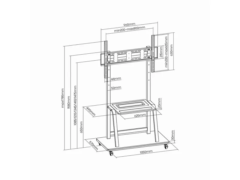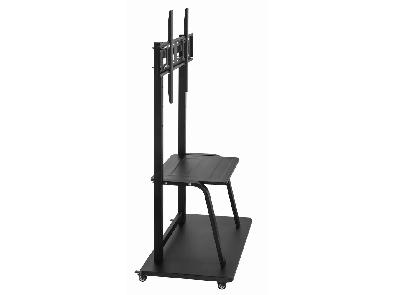 Kenmerken: Metal TV floor stand with caster wheels Heavy-Duty steel construction with integrated TV height adjustment Practical shelf for equipment or materials Durable caster wheels with locking mechanism Supports most 37'' - 100'' LCD TV’s VESA compatible, max. 800 mm x 600 mm Specificaties: Material: steel Surface finish: powder coating Color: black Supported screen size: 37'' - 100'' VESA support: 200 x 200, 300 x 200, 400 x 200, 300 x 300, 400 x 300, 400 x 400, 600 x 400, 800 x 400, 800 x 600 mm TV weight capacity: 150 kg Shelf weight capacity: 20 kg Net weight: 26.1 kg Dimensions: 1050 x 570 x 1785 mm