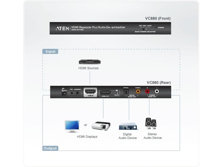 The VC880 is an HDMI repeater with an added audio de-embedder that extracts and converts the audio signal from the HDMI input. This means that as well as the repeated HDMI audio and video signal output. With support for 3D TV formats, the VC880 is ideal for users who want to enjoy high definition video with their choice of high definition audio output on TVs, projectors, A/V receivers or speakers.