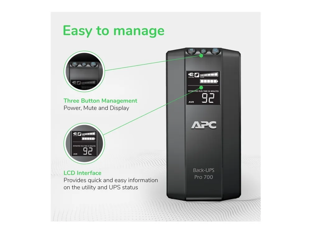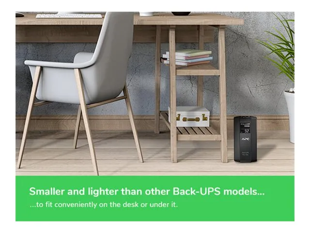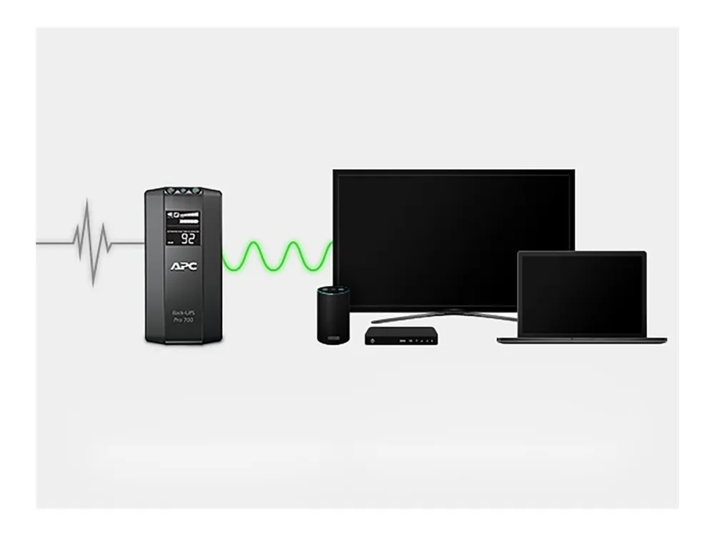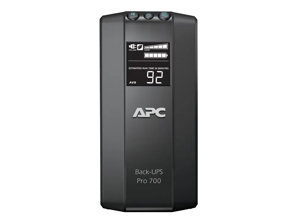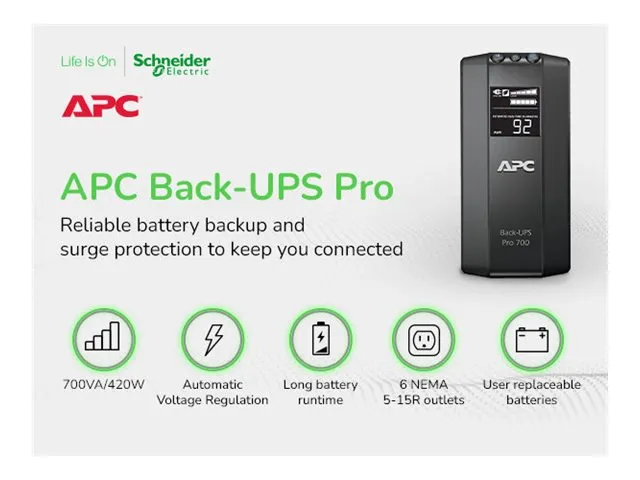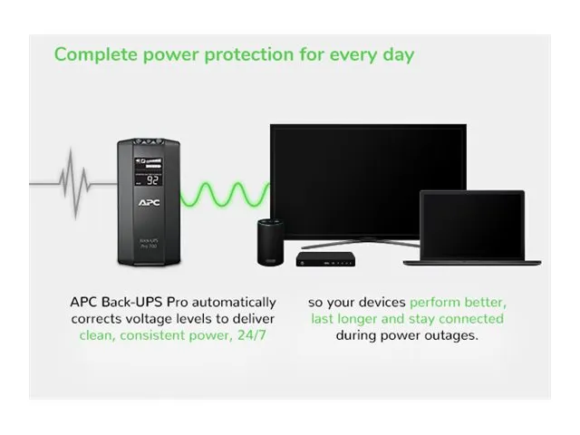 The Back-UPS Pro provides abundant battery backup power, so you can work through medium length power outages. It safeguards your equipment against damaging surges and spikes that travel along utility and data lines. The Back-UPS Pro also features automatic voltage regulation (AVR), which instantly adjusts high and low voltages to safe levels, so you can work indefinitely during brownouts and overvoltages.