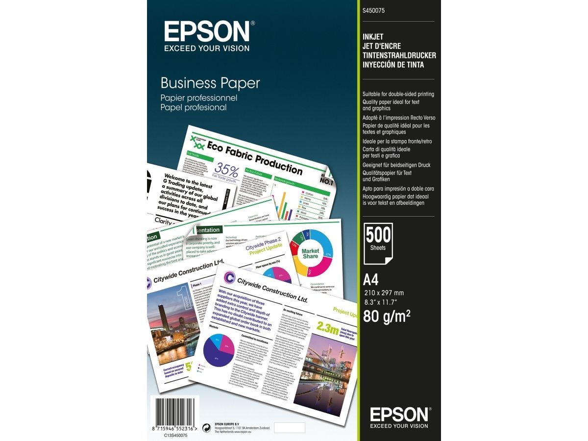 Präzise Ergebnisse Mit Epson Business Paper drucken Sie gestochen scharfe Texte und Grafiken mit brillanten Farben. Es eignet sich daher ideal für die Produktion von Berichten, Memos, Newslettern und auch Hausaufgaben. Das Papier mit 80 g/m² lässt sich auf beiden Seiten bedrucken und stellt somit die perfekte Ergänzung zur neuesten Generation unserer WorkForce-Drucker dar.