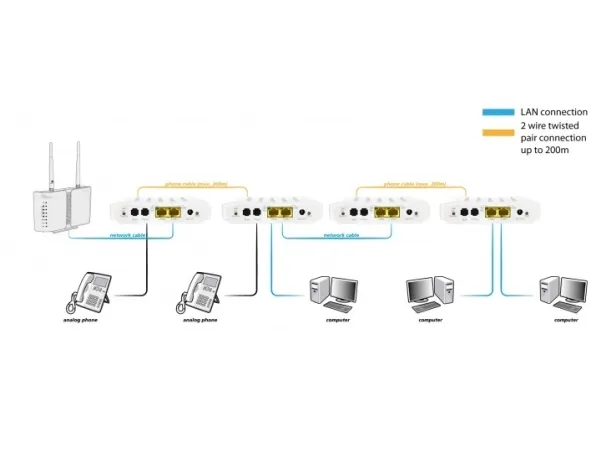 Allnet punkt-til-punkt modem G.hn via 2-lederMed G.HN Gigabit Ethernet Bridge ALL-GHN101-2wire kan du udvide dit private netværk derhjemme, via den eksisterende telefonledning. Der kræves ingen yderligere netværkskabler. Du kan blot bruge den eksisterende telefonledning i væggen. Med en frekvens på (6 MHz) er sameksistensen med ADSL og VDSL IKKE sikret. Med ALL-GHN101-2wire kan du hurtigt udvide dit netværk uden ny kabelføring og med lidt besvær.