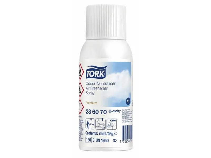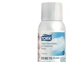 Tork Airfreshener Spray Neutral kontrollerer effektivt lugt på dine toiletter. Den indeholder langtidsvirkende, koncentrerede duftolier og patenterede, lugtneutraliserende stoffer, som fjerner lugtgener og sikrer frisk luft i lang tid. Sprayen er velegnet til Tork Dispenser Airfreshener Spray.