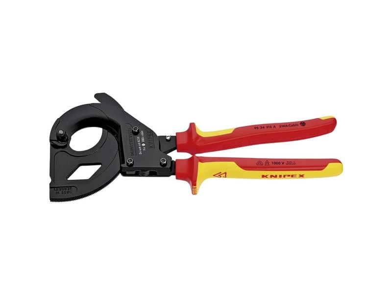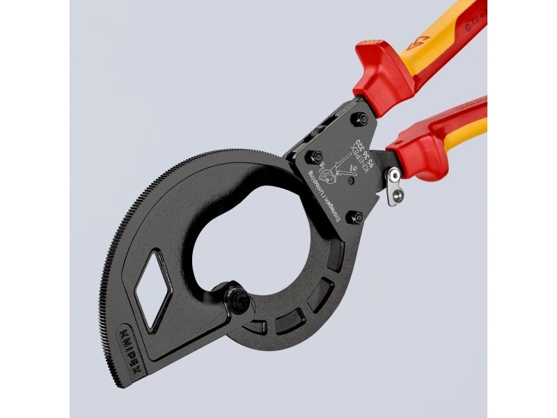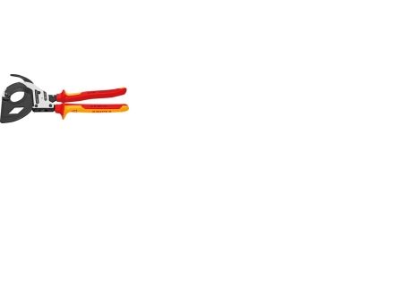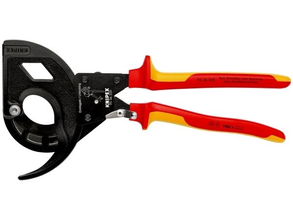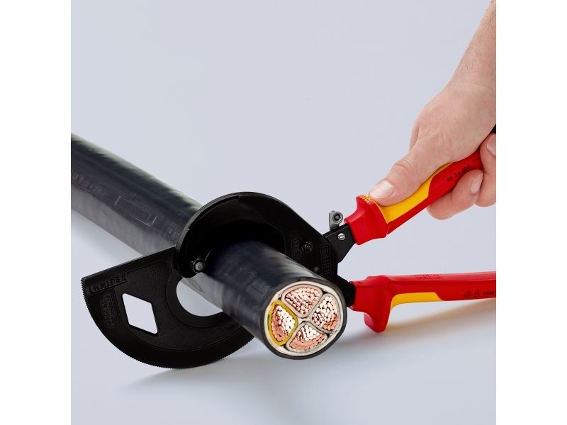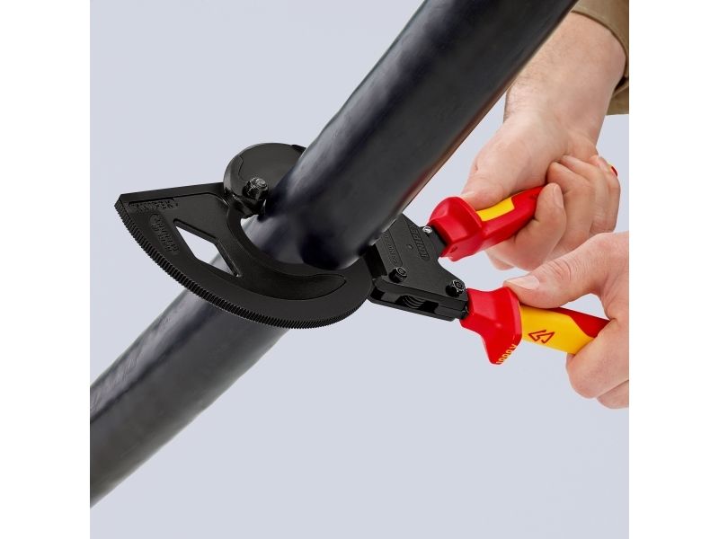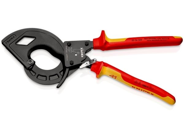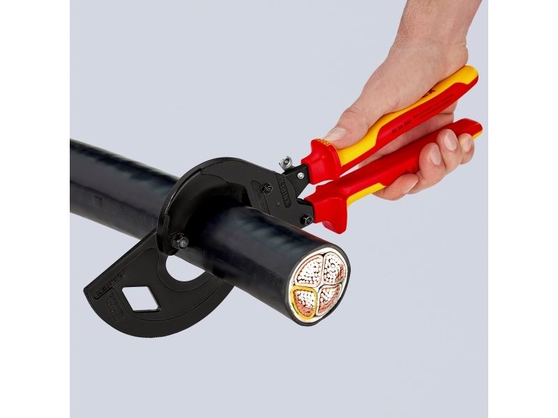 - Sturdy. Easy to use. Stable. - Innovative ratchet-drive. - For cable up to 60 mm diameter. - easy handling due to low weight (825 g) and compact construction (320 mm length) - also usable in confined areas - cutting through copper and aluminium cables with diameters of up to 60 mm in one-hand and two-hand operation - hardened cutting edges, precisely ground, cut smoothly and neatly without crushing - for cutting copper and aluminium single conductors as well as multiple stranded cables (not suitable for steel wire and wire ropes) - innovative three-stage ratchet-drive with high leverage for easy cutting in one-hand and two-hand operation - fixed handle with support area for putting down the pliers when cutting - High-grade special tool steel, forged, oil-hardened