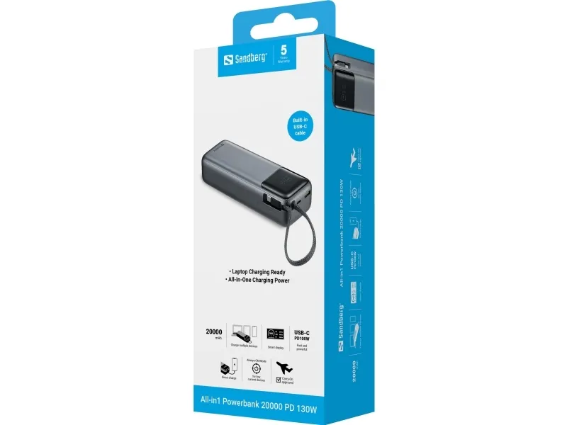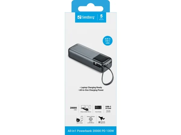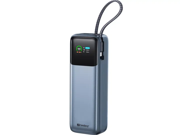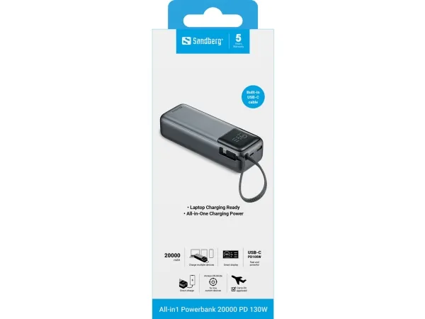 Sandberg All-in1 Powerbank 20000 PD130W leverer op til 130W via USB-C – nok til at lade selv strømkrævende laptops og tablets hurtigt op. Det integrerede USB-C kabel gør det nemt, og med både USB-C og USB-A porte har du maksimal fleksibilitet til opladning af flere enheder. Det stilrene display viser dig præcis, hvor meget strøm der er tilbage, samt live input og output. Alt sammen i en rejsevenlig størrelse med 20000 mAh kapacitet – lige til at tage med i flyet.