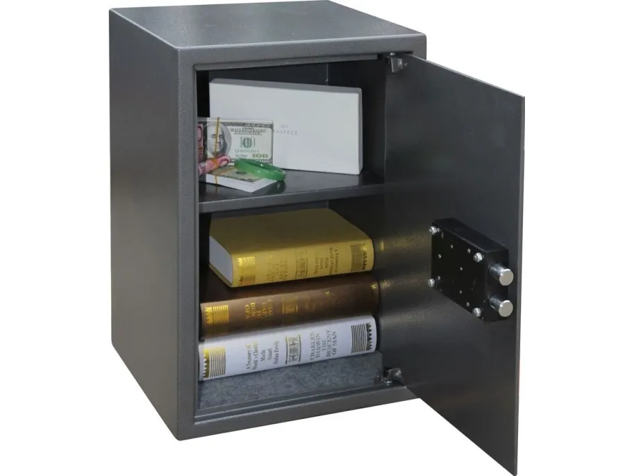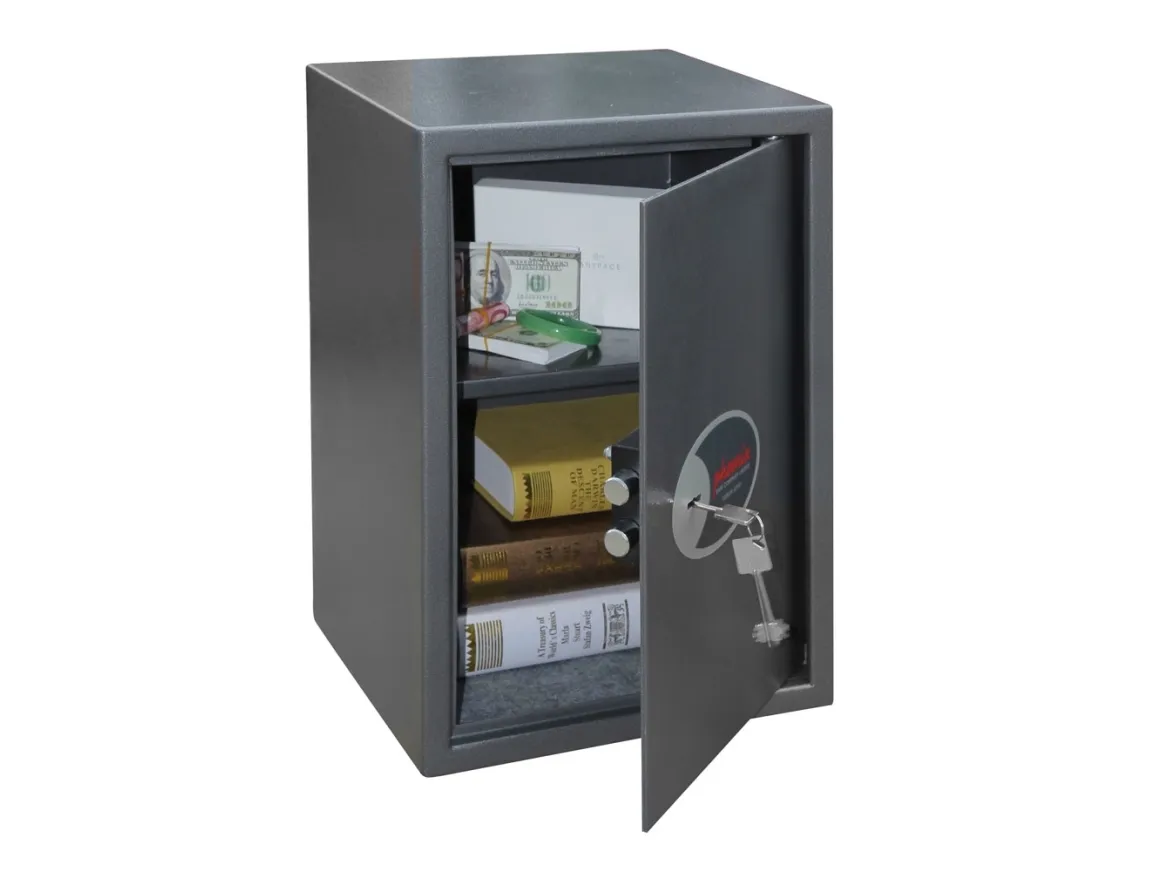 - Recommended for overnight cash cover of £1,000 cash or £10,000 valuables.* - The SS0800K is fitted with a high security key-lock and comes complete with two keys. - Vela safes supplied as standard with twin live locking bolts and concealed internal hinges for increased security. - Ready prepared for fixing to the floor or wall, with fixing bolts supplied for brick walls or concrete floors - Finished in a high quality scratch resistant Metallic Graphite paint.