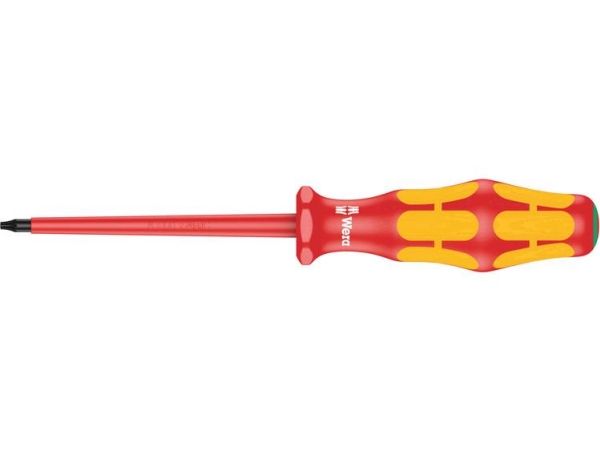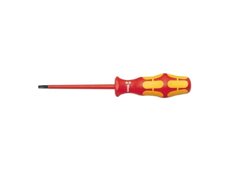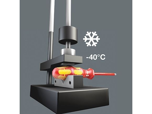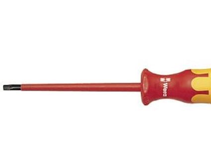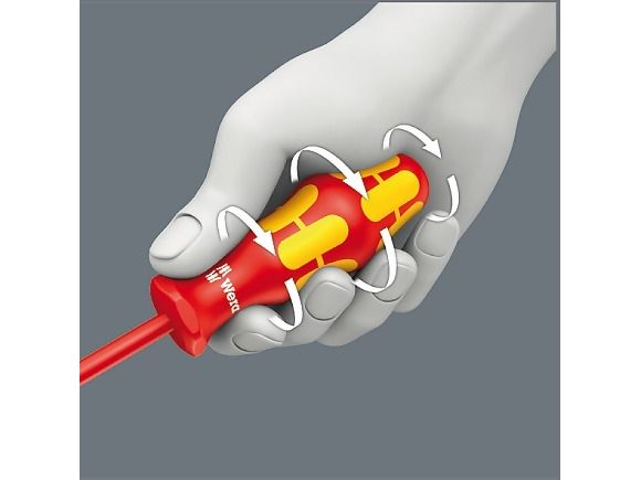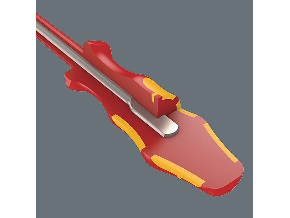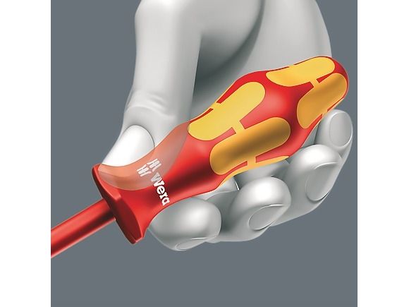 Wera VDE screwdrivers with multi-component Kraftform Plus handle for fast and low-fatigue working: hard gripping zones for high working speeds whereas soft zones ensure high torque transfer. Individually tested in water bath at 10,000 volts for secure work at the permissible voltage of 1,000 volts. “Take it easy” tool finder with colour coding according to profiles and size stamp – for simple and rapid accessing of the required tool. The hexagonal anti-roll feature prevents any bothersome rolling away at the workplace.