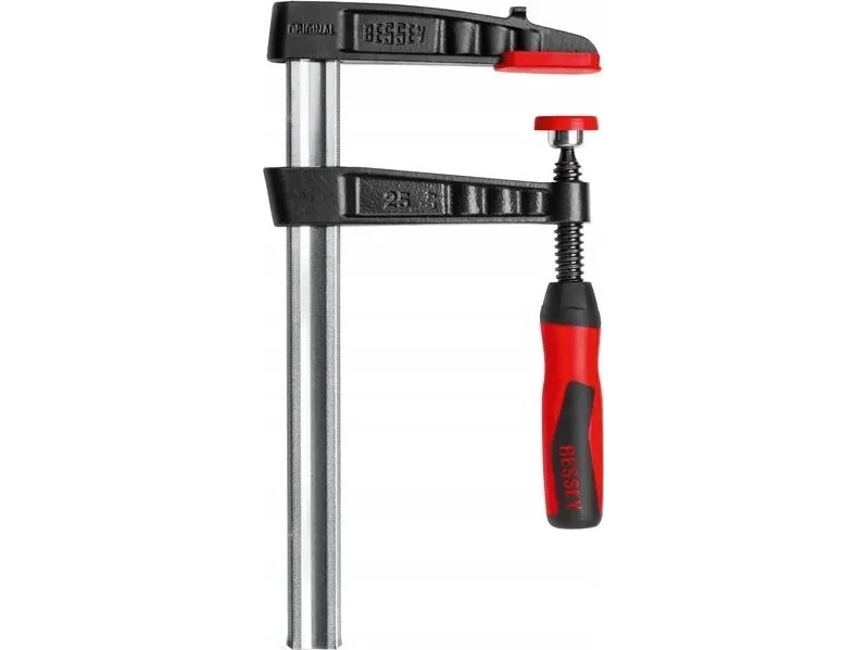 Clamping force up to 6,000 N High-quality 2-component plastic handle Pressure plates can be replace by hand – no tools required (from 80 mm throat depth) With protective caps on the clamping surfaces Stable profiled rail with serration BESSEY anti-slip system (from 80 mm throat depth)