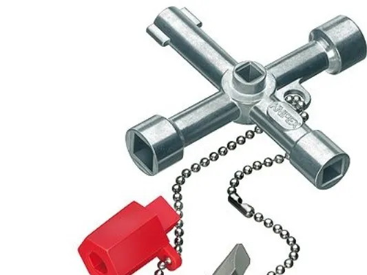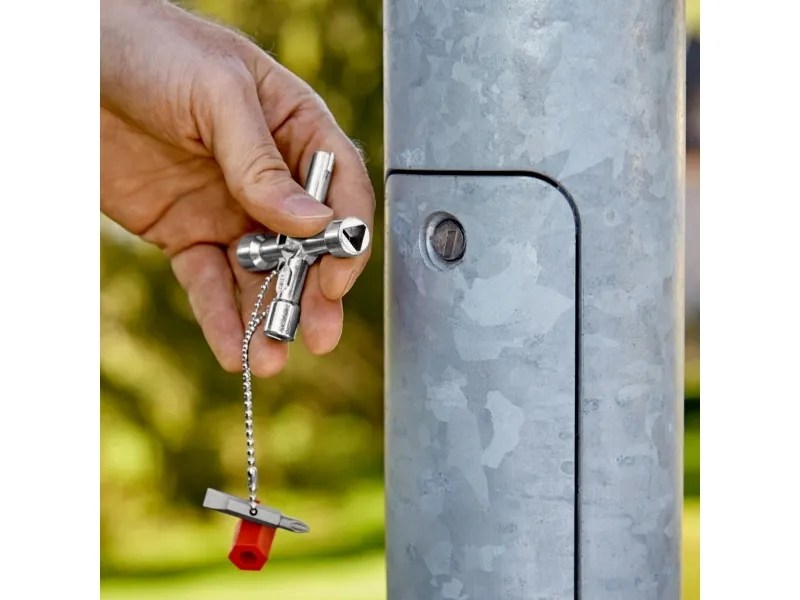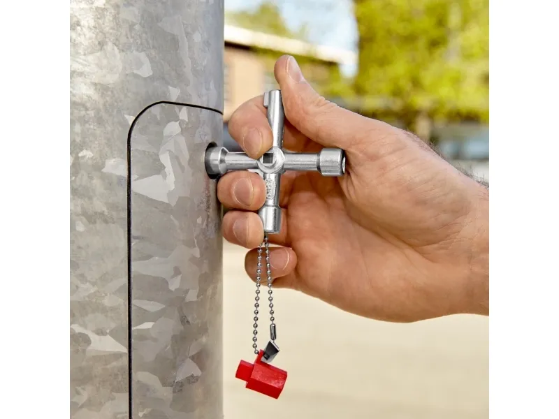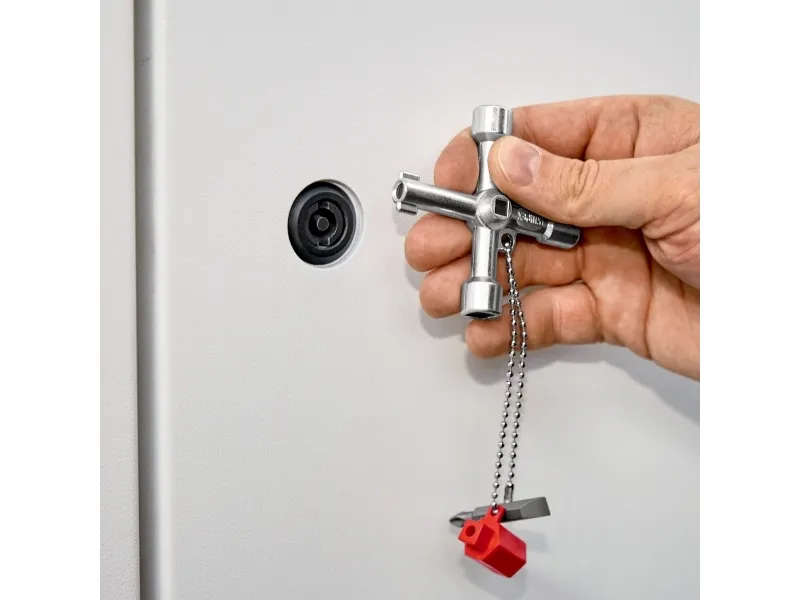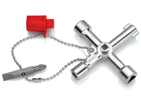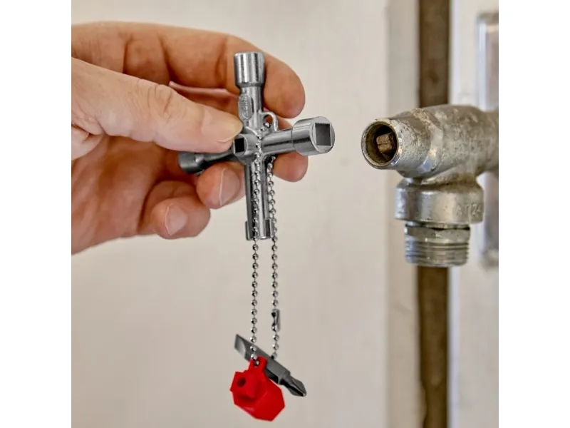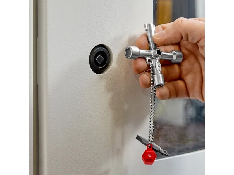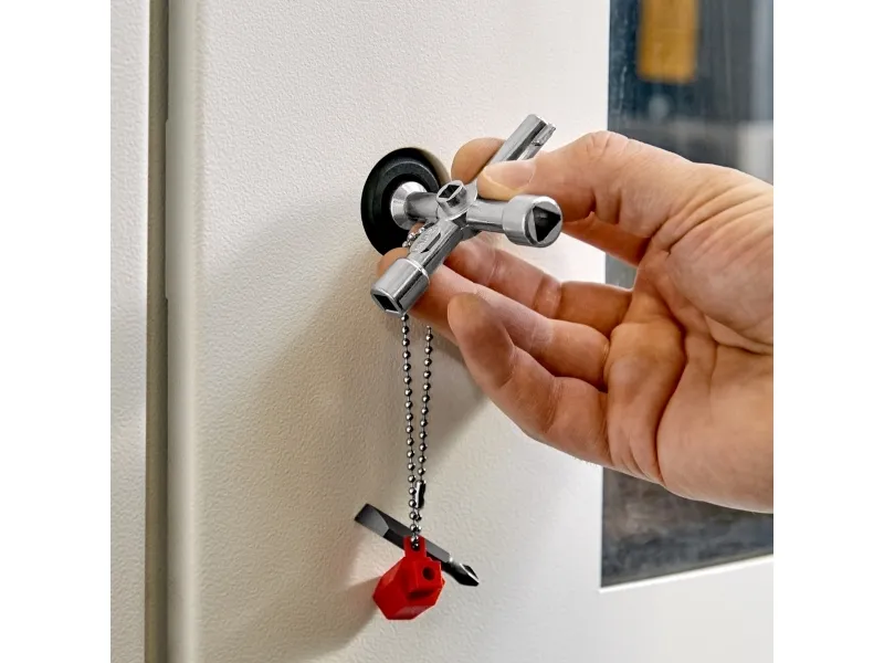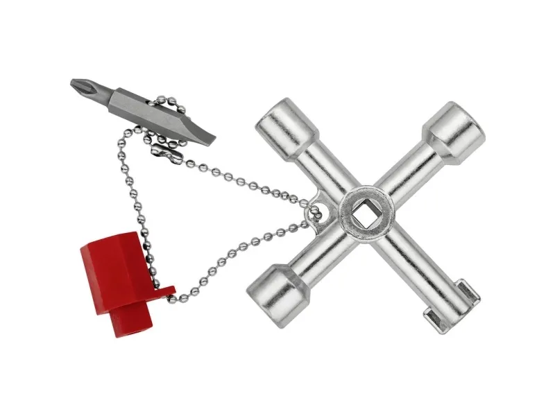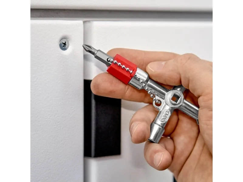 00 11 03 Schraubenschlüssel für die Lenkung Für Schaltschränke, Verriegelungssysteme für Gas-, Wasser- und Stromversorgung. Für haustechnische Anlagen, z.B. Klima- und Lüftungsanlagen, Verriegelungsventile, Netzschalttafeln usw. Mit Bit-Einsatz: 1,0 x 7 mm Kerbe und PH2-Kreuzschliff. Mit Adapter für 1/4" Bits an einer Befestigungskette. Zusätzlicher Bithalter für 1/4" Bits in einem Arm. lange Ausführung, Armlänge insgesamt: 76 mm. zusätzlicher Vierkant 5 mm