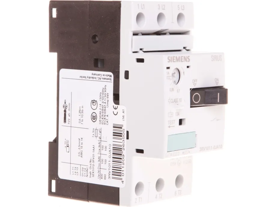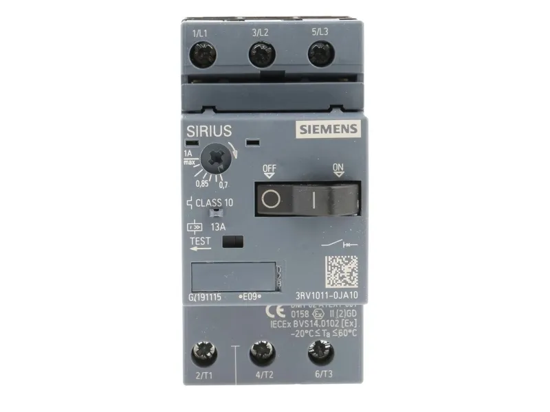 Effektafbryder, S00, motorbeskyttelse, Class 10, A-udl. 0,7-1A, N-Udl. 13 A. Effektafbryder størrelse S00 til motorværn, KLASSE 10 A-udløser 0,7...1 A N-udløser 13 A skruetilslutning standardbrydeevne effektafbryder SIRIUS 3RV1 til sikker frakobling ved kortslutning og beskyttelse af forbrugere og anlæg mod overbelastning samt til sikker adskillelse af anlægget fra nettet. De mest kompakte og klimafaste afbrydere er optimeret til anvendelse i forbrugerforgreninger takket være deres lave spildvarme, naturligvis er de også egnet til IE3/IE4-motorer og ligeledes til kobling af jævnstrøm. Globale godkendelser (for eksempel IEC og UL/CSA) og anvendelse i områder med eksplosionsfare applikationer (ATEX eller IEC Ex) er en selvfølge. Der findes apparatvarianter til motorbeskyttelse, som hoved- og NØDSTOP-kontakt og til anvendelse i IT-net. De fås med skruetilslutning og fås efter eget valg med indbygget hjælpekontakt. De
