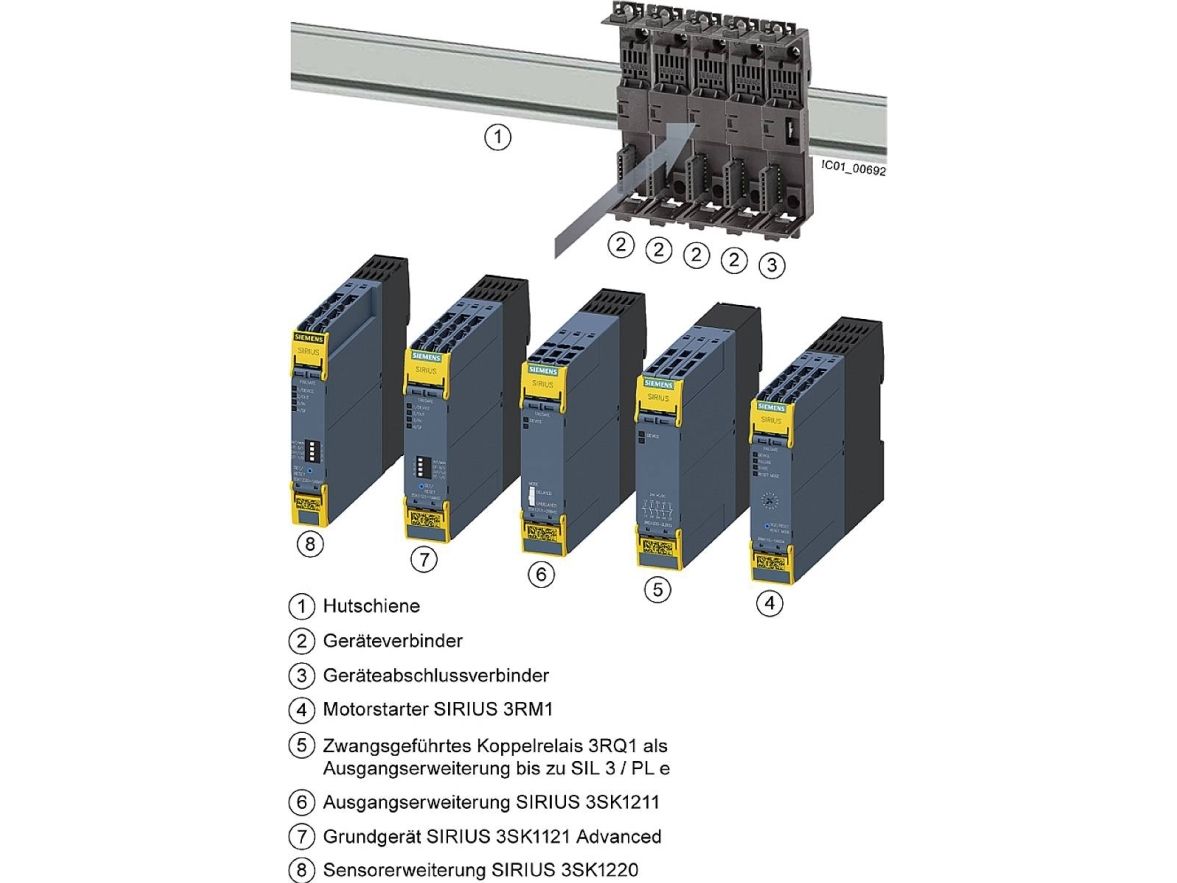 SIRIUS Sicherheitsschalter Klemmen IP20 StandardSIRIUS Sicherheitsschalter Grundgerät Standard Serie Relais Teilungskreise 3 Endschalter + Relais Fernanzeigekreis 1 Öffner US = 24 V AC/DC Federzuganschluss