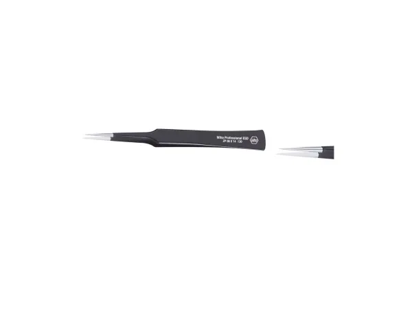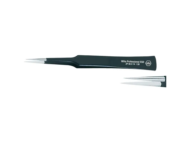 Standards IEC 61340-5-1. Tip form Straight with long, rugged tip - "American shape". Design Smooth gripping surfaces, gripping surfaces without grooves. Non-glare black coated, anti-static. Anti-magnetic and acid-resistant. Surface resistance 10^6 - 10^9 ohms. Material Special alloyed, non-rusting, chromium-nickel stainless steel. Application Precision tweezers for gripping and holding electronic components.