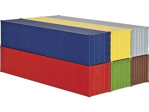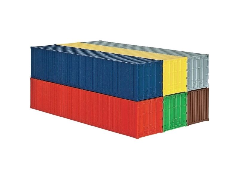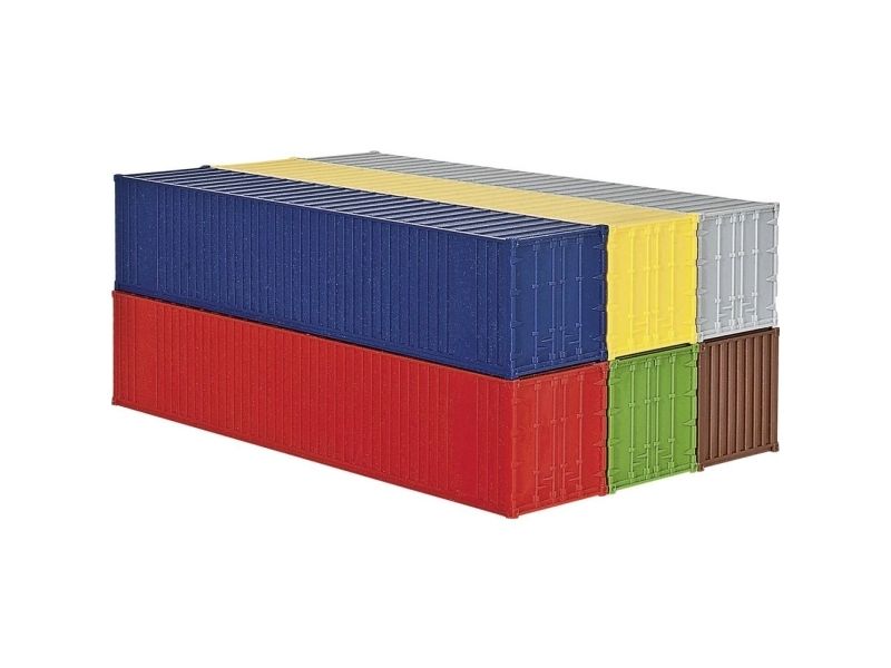 H0 40'-Container (6 Stück )40-Fuß-Container (6 Stück) für Schwertransporte. Dieser Container bildet die Grundlage für den Warentransport zwischen den einzelnen Kontinenten. Wie 20-Fuß-Container sind sie auf Straßen, Schienen und auf dem Wasser nicht mehr wegzudenken. Kibri-Baukasten.