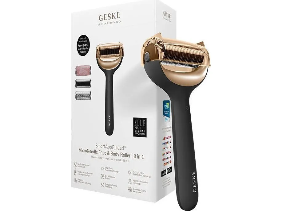 GESKE SmartAppGuided MicroNeedle Face & Body Roller 9 in 1 with Rose Quartz & Cooling Attachment Electric Derma Roller Microneedling Device Needle Roller Beauty Roller for Face and Body Gray