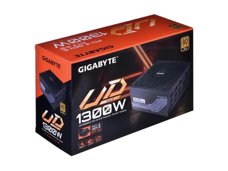 COMPACT DESIGN Leveraging the engineers' excellent design capabilities, cooling technology and higher-quality materials, GIGABYTE has reduced the length of the power supply to an amazing 160mm compared to traditional design. It can be easily installed in any chassis without space constraints.Gigabyte UD1300GM PG5. Total power: 1300 W, AC input voltage: 100 - 240 V, AC input frequency: 50 - 60 Hz. Motherboard power connector: 20+4 pin ATX, Motherboard power cable length: 61 cm, SATA power cable length: 150,600 mm. Purpose: PC, Power supply unit (PSU) form factor: ATX, 80 PLUS certification: 80 PLUS Gold. Product colour: Black, Cooling type: Active, Fan diameter: 12 cm. Cables included: CPU, PATA, Peripheral (Molex), SATA