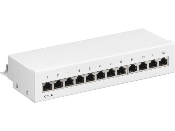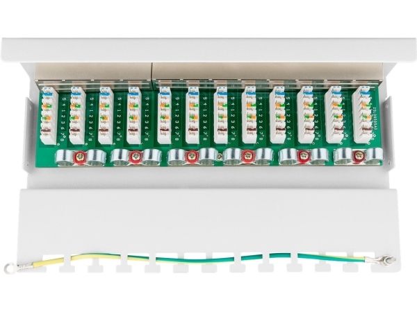 STP geschirmt Farbversion 12-Port-Patchfeld mit RJ45-Buchsen zum Anschluss von konfektionierten CAT-6-Netzwerkkabeln Konzipiert für löt-, schraub- und abisolierfreie Anschlusstechnik (LSA-Montage, Werkzeug erforderlich) Patch-Panel inkl. Befestigungsschrauben zur Montage an Wand und Desktop CAT-6-Verteiler für Kabeldurchmesser bis zu 0,64 mm (AWG 22-26) Geschirmte Ports in hochwertigem Metallgehäuse mit „Easy Open“-Funktion (Öffnung ohne Schrauben und Werkzeug) Verteilerfeld mit nummerierten Ports für eine ideale Kabelorganisation Anschlussleisten mit Farbmarkierung gemäß TIA 568 A/B für ein einfaches und korrektes Verbinden