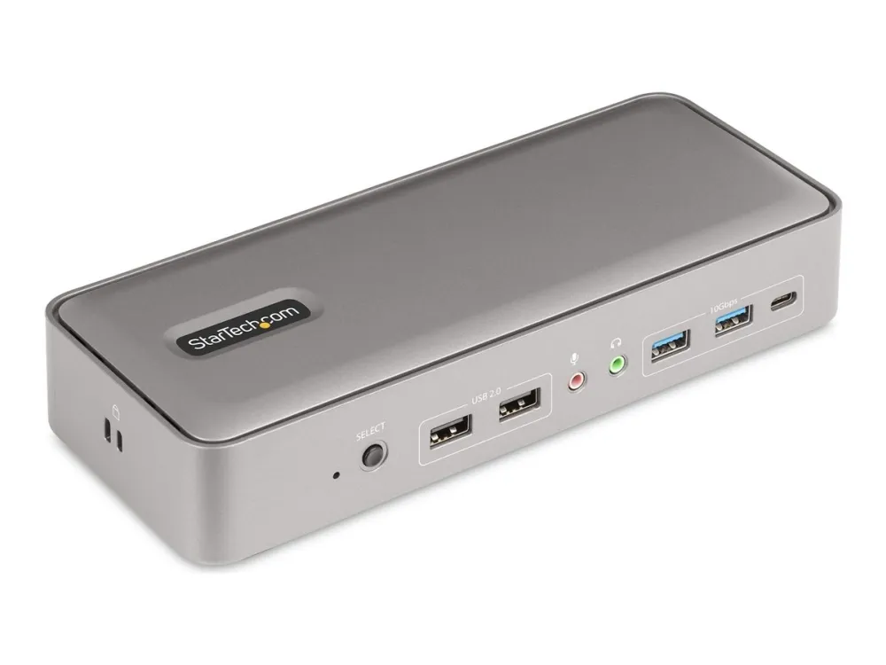 The StarTech.com Dual-Laptop USB-C KVM Docking Station is a comprehensive solution designed to enhance your productivity and connectivity. With dual monitor support at 4K 60Hz, it offers clarity and smoothness for all your visual needs. The docking station provides efficient power delivery, with 90 W for the active host device and 45 W for the standby, ensuring your laptops are always charged. Multiple USB ports, including USB 2.0 and USB 3.2 Gen 2, along with Ethernet connectivity, allow for the seamless connection of all your essential peripherals and network. Advanced features such as MAC address pass-through, full duplex support, and up to 10Gbps data transfer speeds make this docking station a powerful tool for any professional setup. Additionally, it adheres to several compliance standards, including RoHS and WEEE, and includes both Kensington nano and standard security slots, offering peace of mind and reliability. Whether for work or play, this docking station is designed to meet the needs of demanding multitasking environments.