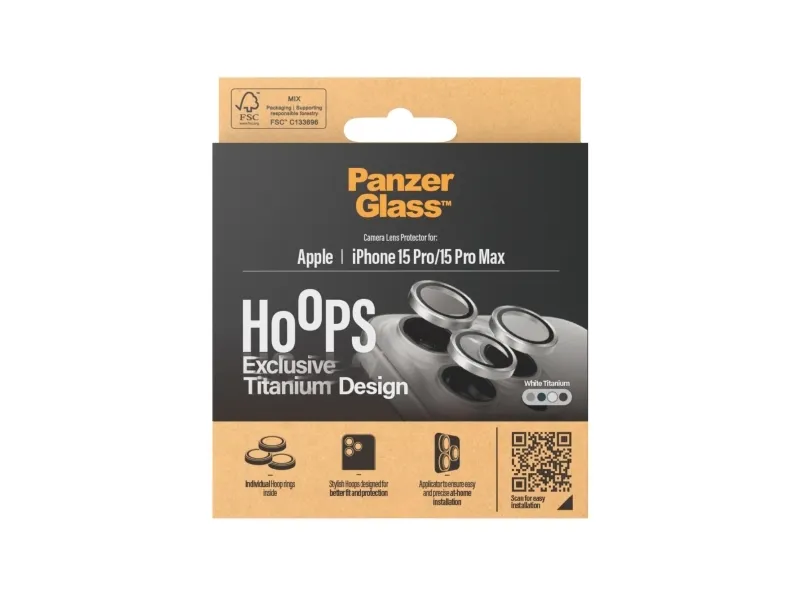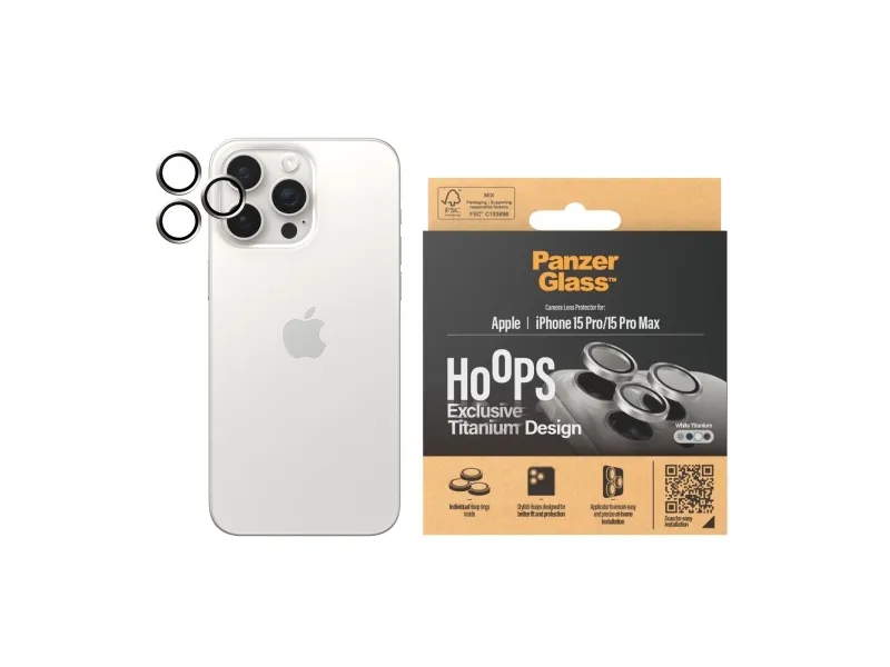 Equipped with tougher-than-tough ceramic glass and a beautiful titanium frame, this PanzerGlass® Hoops® camera lens protector protects your lenses, while looking great! Scratch-creating bumps, drops on stone-hard floors, and other hazards of everyday life are no match for these slim profile optic rings. There’ll be no “Oops!” with Hoops®! And if you’re worried about image distortion, rest easy: Hoops® don’t affect the clarity of your lenses or the quality of your photos – they just give you a bit more peace of mind. Hoops® protect and prolong the lifetime of your phone so that one day you can pass it on to someone else who will love it just as much as you do. It’s the new circle of phone life. By extending the lifespan of our devices, we postpone the need to produce new devices. This is one way of working toward a more sustainable future. Another is to use less packaging: In 2024, we reduced the amount of paper in our PanzerGlass® core product packaging design by an average of 66 %*. So, of course, this product comes in a recyclable FSC™-certified box. The optic rings are designed for easy application and perfect fit. They are equipped with a silicone adhesive along the edges and come with an easy-to-use applicator that makes installation a piece of cake (seriously!). And remember: Once installed, you’ll never again fear your phone falling camera-first. This might not happen, but then again … it might! *Reduction from 2022-2024 measured by comparing selected products from the PanzerGlass® core range.PanzerGlass ® Hoops® Titanium Camera Lens Protector White iPhone 15 Pro | 15 Pro Max. Brand compatibility: Apple, Compatibility: Apple - iPhone 15 Pro, Apple - iPhone 15 Pro Max. Dry application. Protection features: Scratch resistant, Shock resistant. Privacy filtering function, Material: Tempered glass, Product colour: Transparent. Quantity per pack: 1 pc(s)