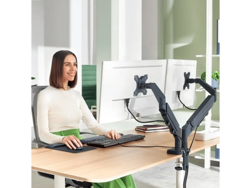 The TÜV and IGR certified Leitz Space Saving Dual Monitor Arm has a positive impact on posture, promotes proper eye alignment and supports neck and shoulder comfort when the height of the monitors are adjusted correctly, and as recommended, to the ideal ergonomic position. The monitor stand remains stable at all heights and angles and can be easily switched between landscape and portrait mode. It's design is ideal for where space is limited and it will free up valuable desktop space thanks to its ultra versatile arms that can effortlessly fold flat, tilt and maneuver in any direction with just one hand. Ergonomically designed to promote wellness and increase productivity.Leitz Ergo Space Saving Dual Monitor Arm. Maximum weight capacity: 9 kg, Minimum screen size: 43.2 cm (17"), Maximum screen size: 81.3 cm (32"), Minimum VESA mount: 75 x 100 mm, Maximum VESA mount: 75 x 100 mm. Height adjustment, Tilt angle range: 0 - 90°. Product colour: Grey