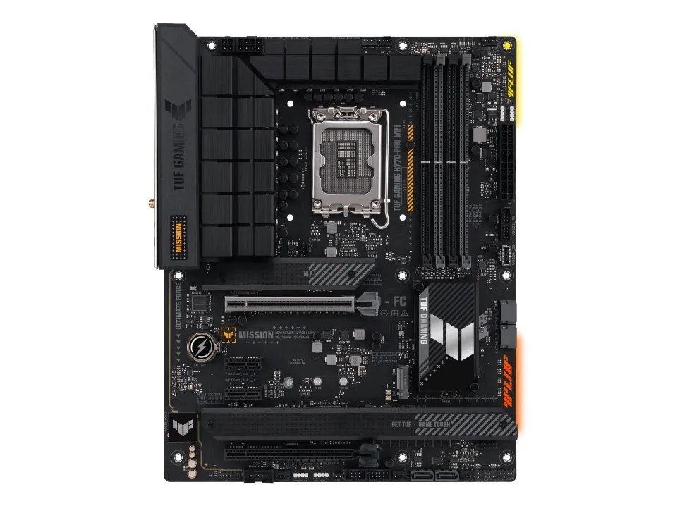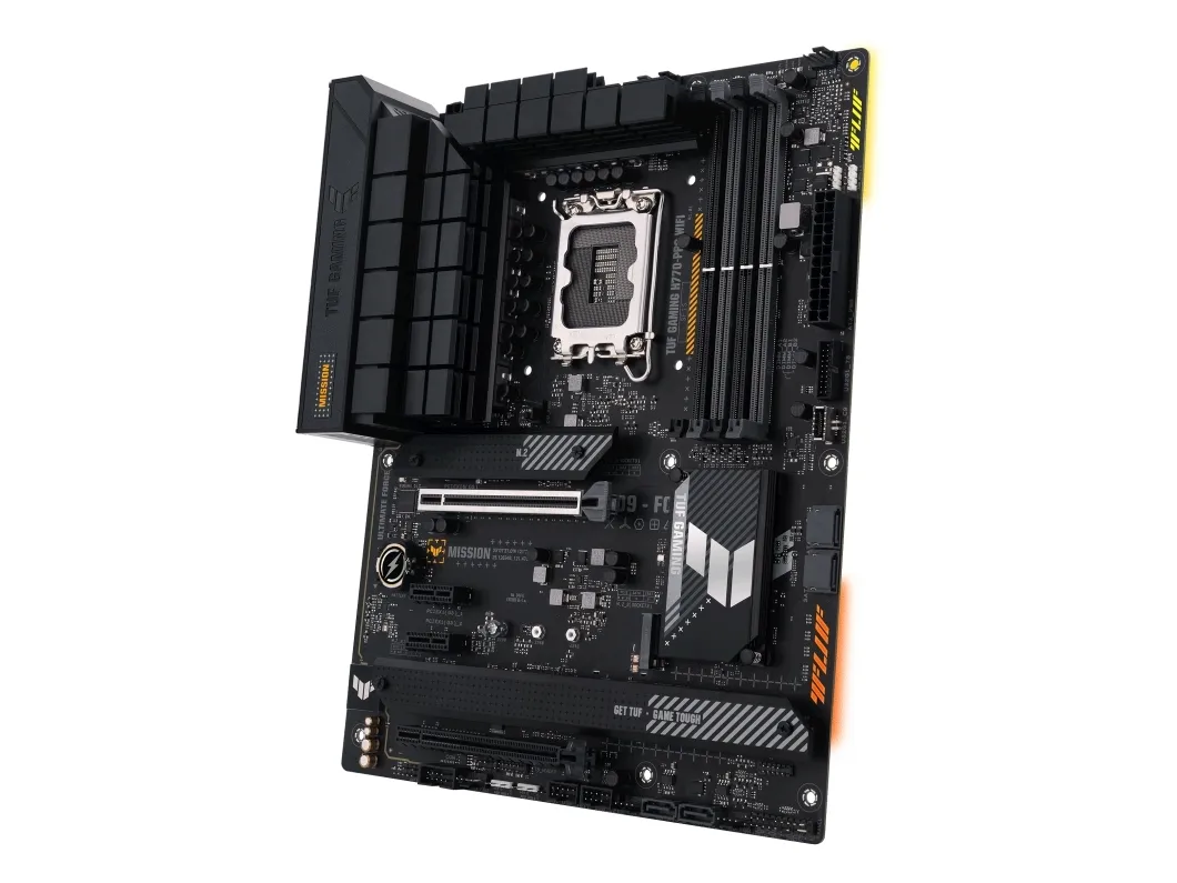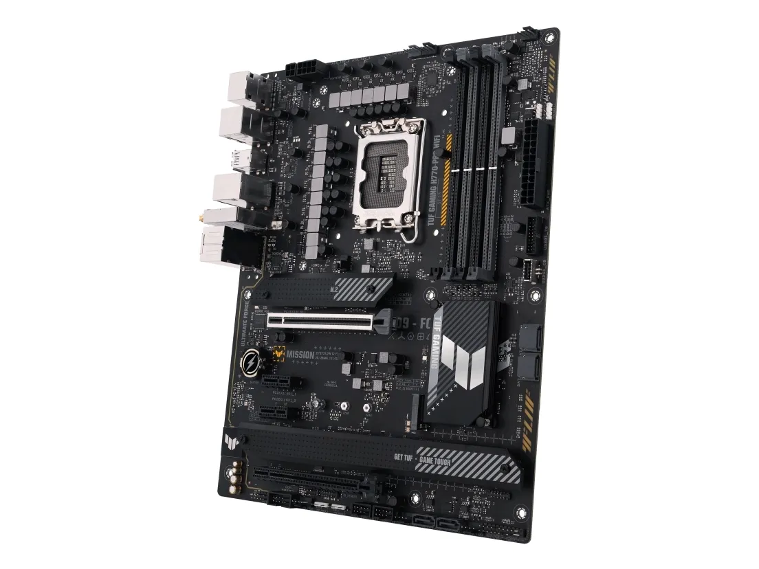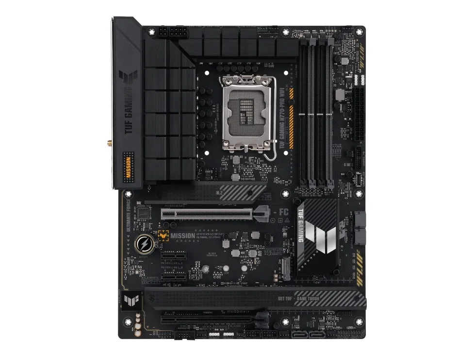 TUF GAMING H770-PRO WIFI takes all the essential elements of the Intel processors and combines them with game-ready features and proven durability. Engineered with military-grade components, an upgraded power solution and a comprehensive cooling system, this motherboard goes beyond expectations with rock-solid performance for marathon gaming. TUF GAMING motherboards also undergo rigorous endurance testing to ensure that they can handle conditions where others may fail. Aesthetically, this model incorporates an embossed nameplate and geometric design elements to reflect the dependability and stability that defines the TUF GAMING series.