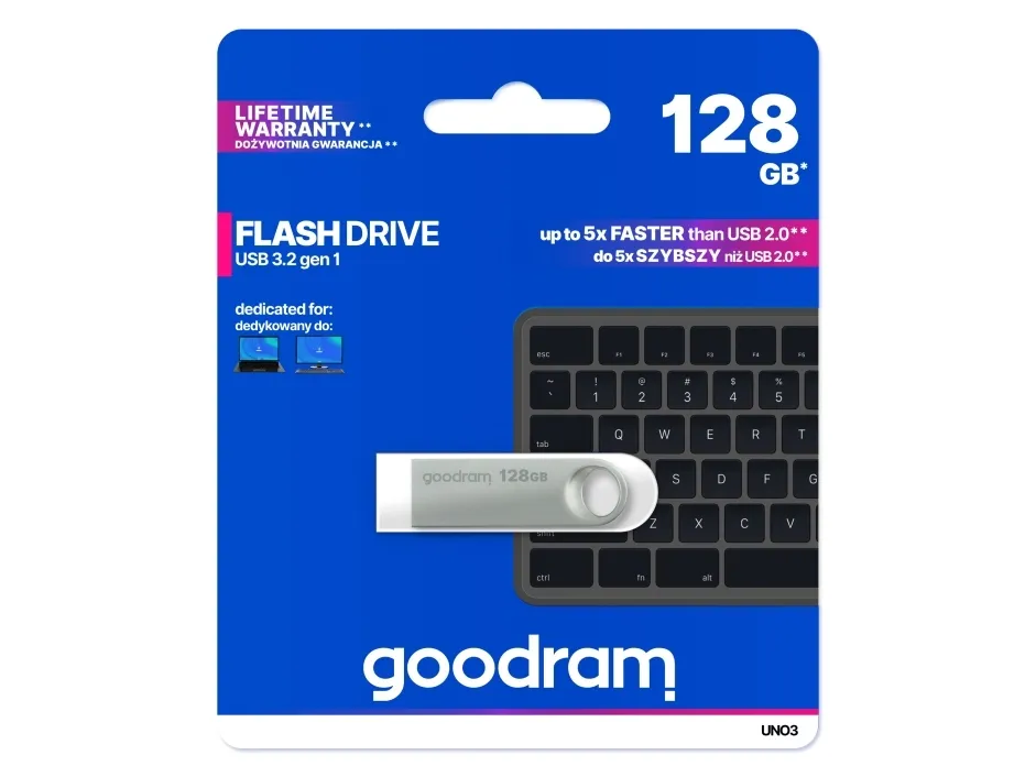 The GOODRAM UNO3 USB flash drive offers reliable performance with a storage capacity of 128 GB, catering to a variety of data storage needs. Designed with COB technology, this flash drive ensures durability and efficiency while being lightweight and portable. It delivers read rates of up to 60 MB/s and write rates reaching 20 MB/s, allowing for quick data transfer and easy access to files, making it an ideal solution for both everyday and professional users.