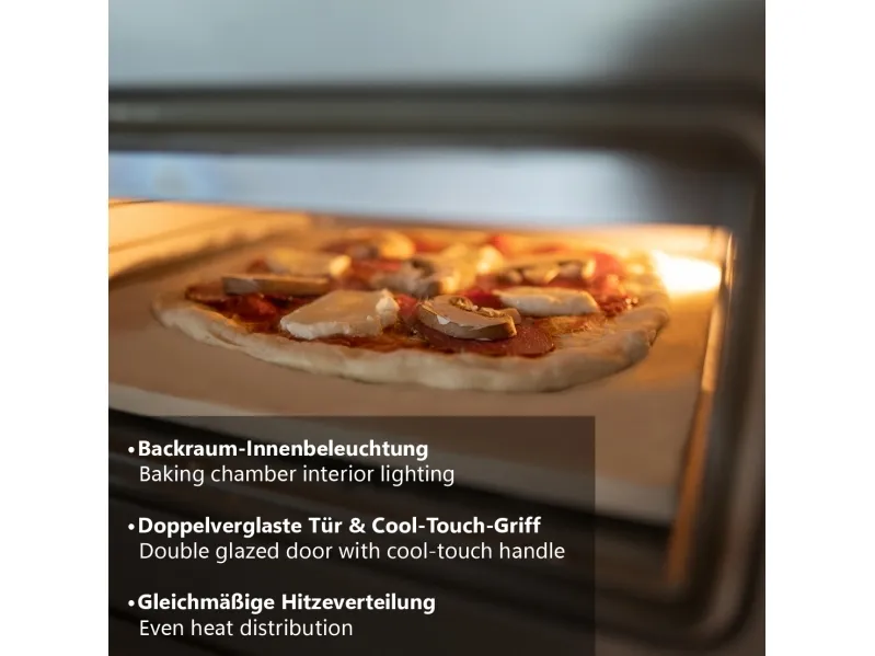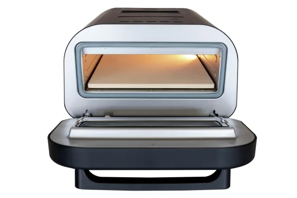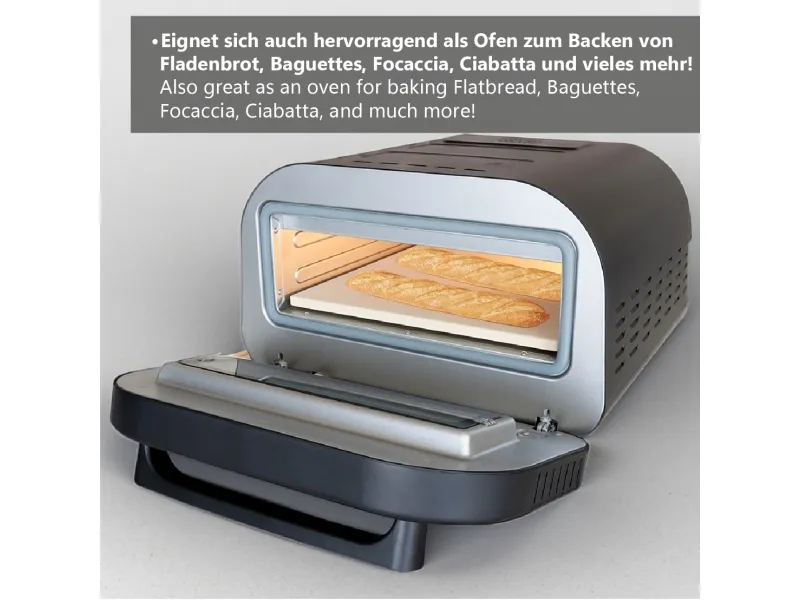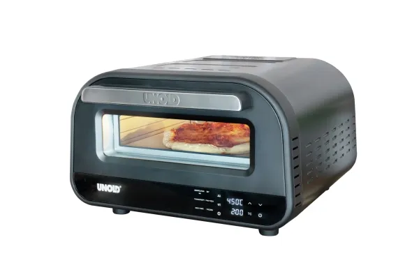 The Don Luigi pizza oven has a sleek black steel design and includes a pizza peel, pizza stone, pizza baking tray and professional pizza cutter. This electric pizza oven can reach temperatures of up to 450°C, allowing you to make the perfect pizza in just about 2 minutes. It is designed for safety and features a double-glazed door and cool-touch handle for easy handling. Say goodbye to gas-powered ovens and enjoy the convenience and efficiency of this electric pizza oven.Unold Don Luigi. Number of pizzas: 1 pizza(s), Product colour: Black, Maximum pizza diameter: 30 cm. Power: 1700 W, AC input voltage: 220 - 240 V, AC input frequency: 50/60 Hz. Width: 431 mm, Depth: 469 mm, Height: 280 mm. Package width: 540 mm, Package depth: 495 mm, Package height: 345 mm. Pizza peel material: Wood