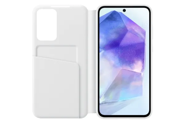 Phone. Wallet. All set in one. Keep your daily card in the Smart View Wallet Case's card pocket so you're always set on the essentials.Samsung EF-ZA556. Case type: Wallet case, Brand compatibility: Samsung, Compatibility: Galaxy A55, Maximum screen size: 16.8 cm (6.6"), Surface coloration: Monochromatic, Product colour: White