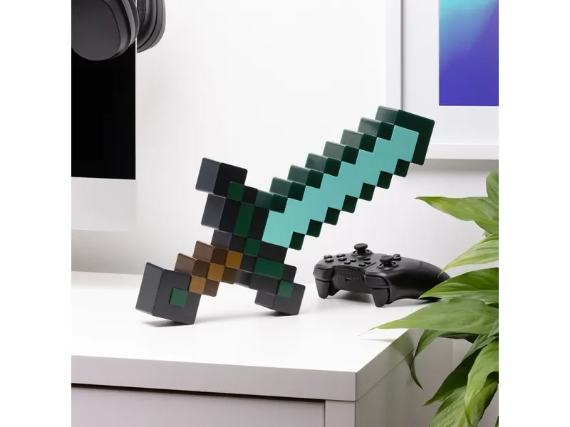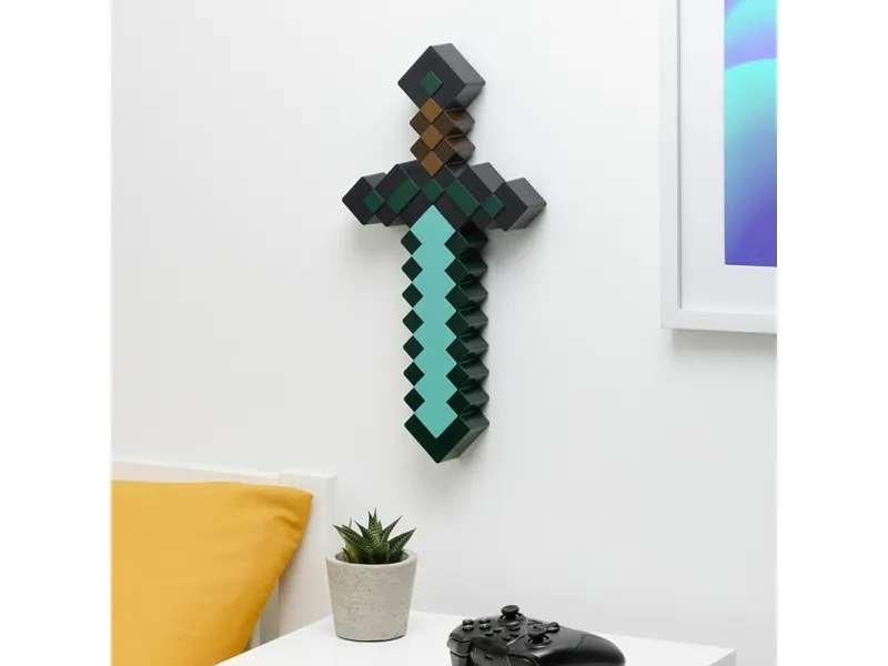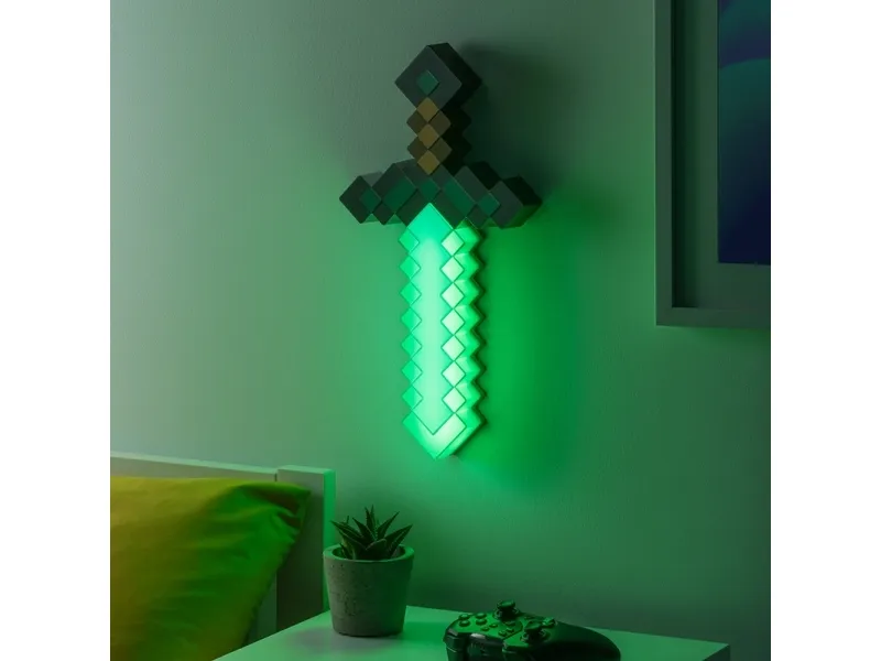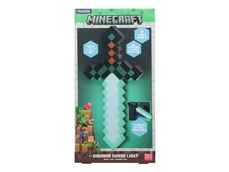 The Paladone Minecraft Sword Light is a decorative lamp that brings the iconic design of Minecraft into any room. With its diamond shape, this lamp serves as an eye-catching piece while providing ambient lighting. Modes such as phasing on/off, music mode, and full glow enhance functionality, allowing for personalized lighting experiences to suit any mood. The inclusion of a USB Type-C charging connector ensures convenient charging, while also making it easy to mount on walls for versatility in display options.