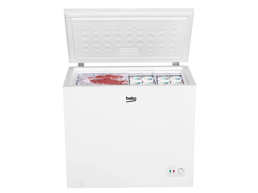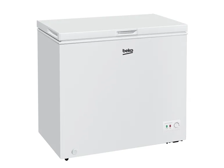 The Beko CF200EWN chest freezer is designed to provide optimal storage for frozen goods with a total net capacity of 198 liters. Featuring static cooling technology, it ensures even temperature distribution throughout the compartment, preserving food quality for longer periods. The freezer's fast freeze function allows for quick freezing of fresh produce, maintaining nutritional value and flavor. With energy consumption of only 200 kWh per year, this appliance is efficient, minimizing energy costs while being environmentally friendly. The appliance operates at a noise level of 40 dB(A), making it a quiet addition to households or businesses. Its elegant design and front panel control make it user-friendly and easy to operate, ensuring access to an effective freezing solution for your needs.