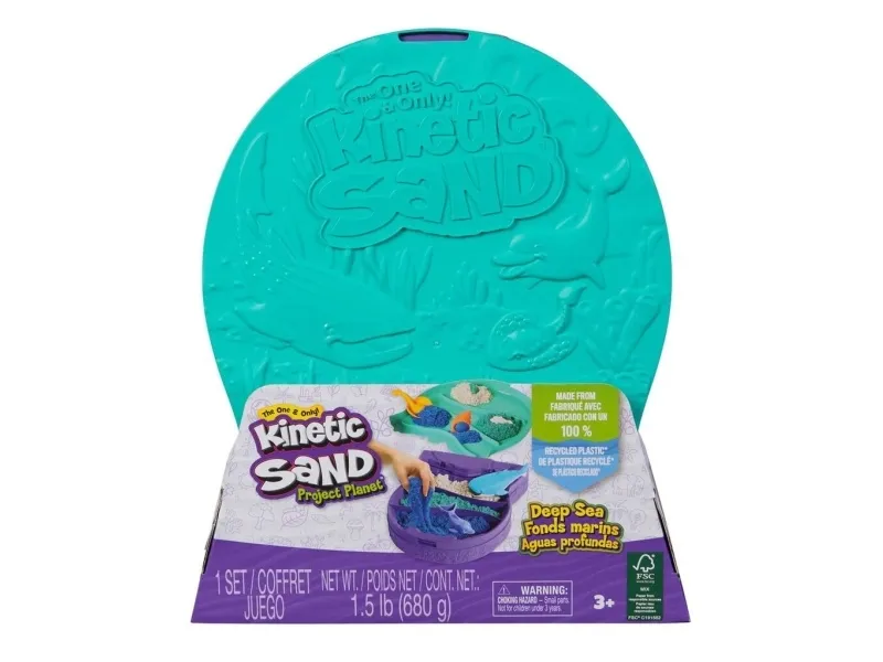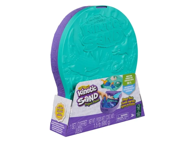 Includes: 24oz Kinetic Sand, 1 Container with Lid, 1 Stingray Scoop/Mold, 1 Dolphin Cutter/Mold, 1 Whale Shark Grater, 1 Shell Scoop, 1 Eco Info CardKinetic Sand , Project Planet Deep Sea with 24oz Sensory Play Sand & Sea Creature Tools, Sustainably Minded Eco Friendly Materials, Holiday Gifts & Stocking Stuffers for Kids Ages 3 and up. Product type: Children's kinetic sand, Recommended age (min): 3 yr(s), Product colour: Multicolour. Package type: Box