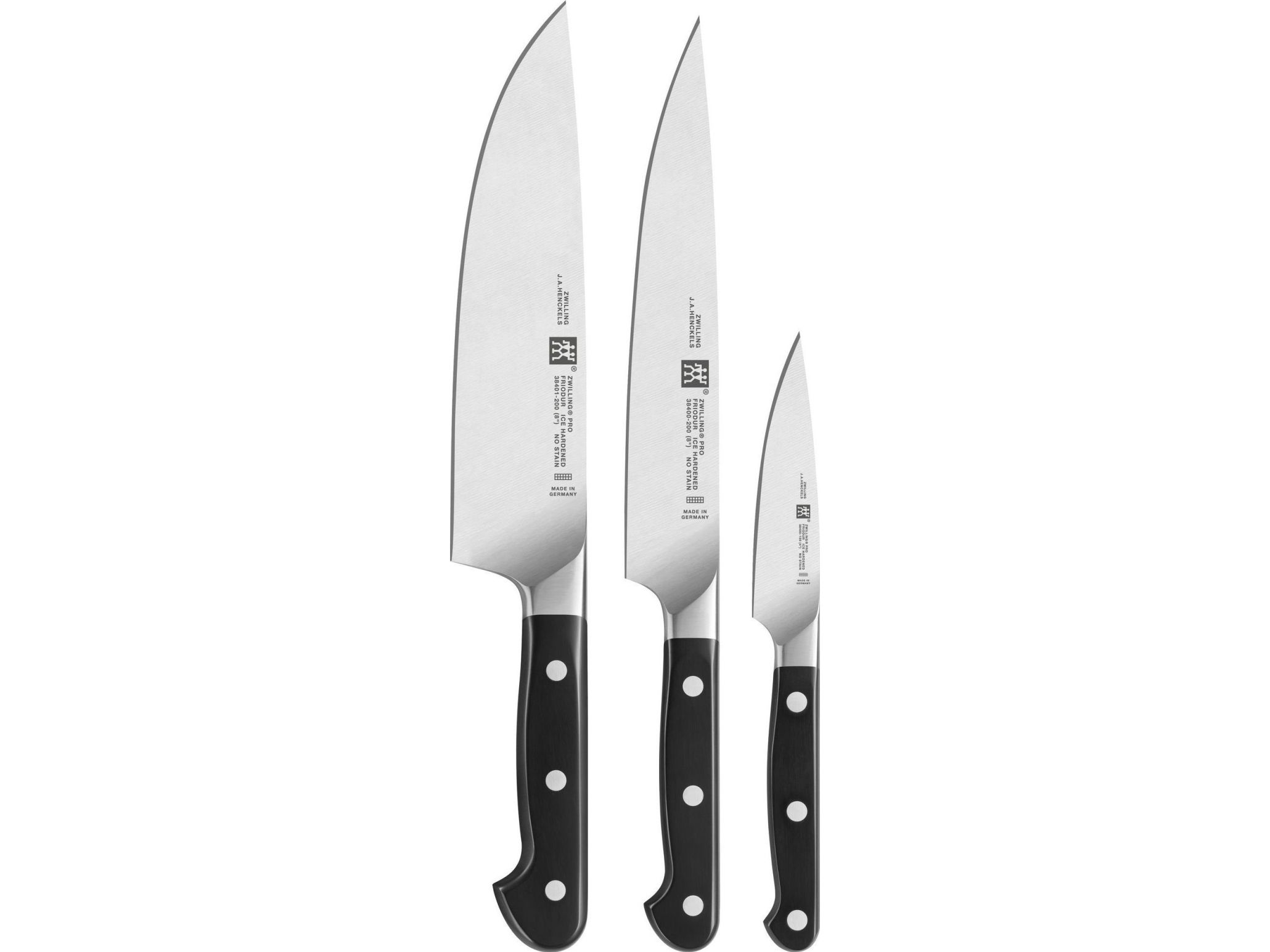The knives of the ZWILLING Pro series win users over with their precision and functionality. The blade is precision-forged from a single piece of steel. It is made of a special steel, which offers the perfect combination of corrosion resistance and hardness. The handle is ergonomically shaped. Three visible rivets hold the durable plastic handle shells onto the blade which extends into the handle - the tang. The weight distribution between the handle and blade is well balanced. The 3-piece knife set will give new impetus to your enjoyment of creative cookery and the preparation of versatile dishes.