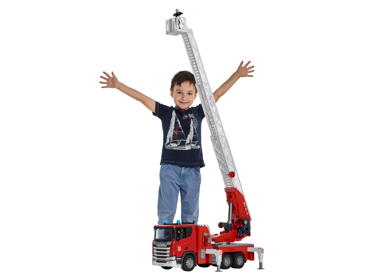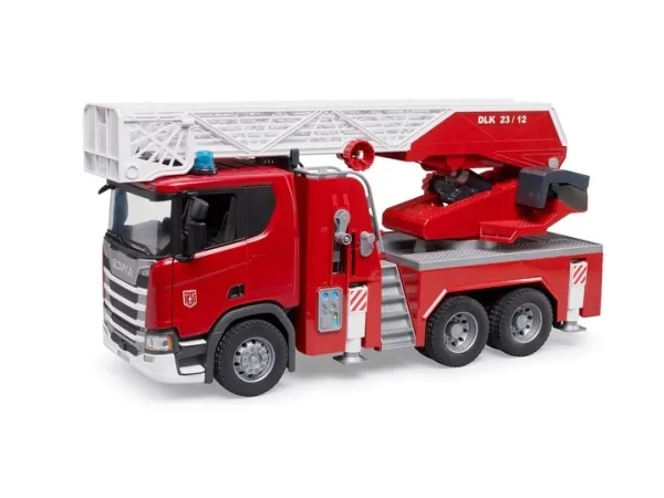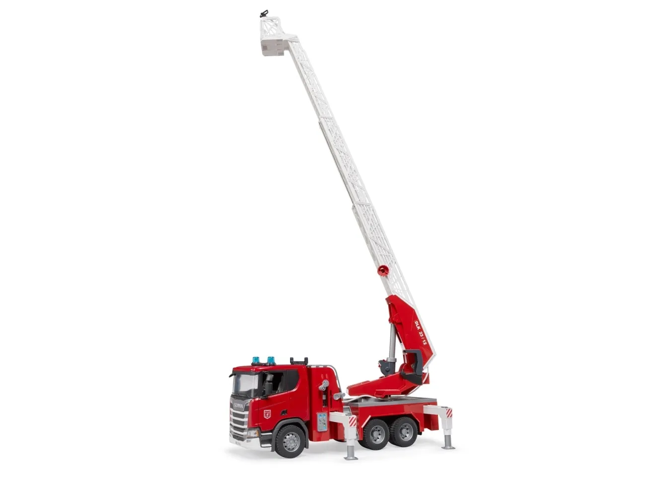 Dabei ist kaum ein Thema spannender nachzuspielen, als ein großer Feuerwehreinsatz. Ein Highlight zum Thema Feuerwehr im BRUDER Sortiment ist der Scania Super 560R Feuerwehrleiterwagen. Neben sämtlichen Details, wie z.B. zu öffnenden Türen, anklappbaren Spiegeln usw., besitzt das Fahrzeug einen integrierten Wassertank, der sich spielend leicht befüllen lässt. Der Wasserschlauch kann aufgewickelt, von den BRUDER-Figuren (z.B. Art. Nr. 60100 nicht im Lieferumfang) gehalten oder an dem Leiterkorb befestigt werden und besitzt eine voll funktionsfähige Wasserspritze. Die Drehleiter mit Rettungskorb kann durch ein Handrad ausgefahren und höhenverstellt werden. Neben zwei Sitzplätzen im Fahrerhaus ist eine zusätzliche Sitzmöglichkeit für die bworld Figur an der Feuerwehrleiter gegeben. Vier ausziehbare Stützfüße können in jeder Situation einen sicheren Stand für das Fahrzeug gewährleisten und ein großes Stauraumfach mit aufklappbarer Tür verschafft zusätzlichen Platz zum Aufbewahren von Werkzeugen. Das Light and Sound Module Art.-Nr.: 02801 mit vier unterschiedlichen Funktionen wie Motorengeräusch, Blinklicht und Sirenengeräusch ist im Lieferumfang enthalten und erhöht nochmals den Spielwert dieser aufwändigen Feuerwehr