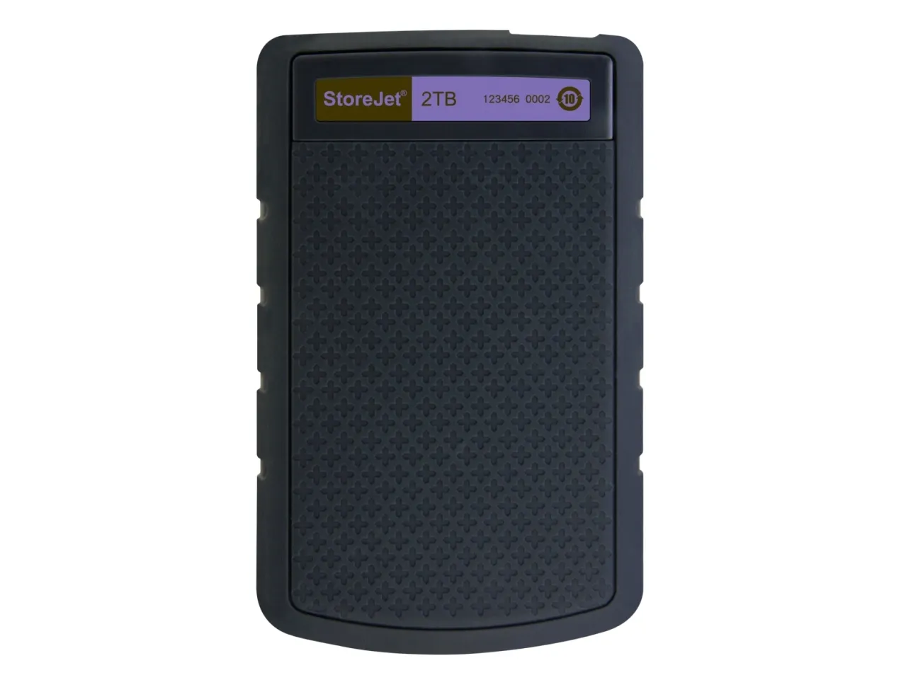The StoreJet 25H3P portable hard drive is a powerful storage device that combines superior performance of USB 3.0 and a three-stage shock protection system that meets rigorous U.S. military drop-test standards. The StoreJet 25H3P is an ideal option for speed lovers. Transferring an entire DVD movie takes less than a minute to complete!