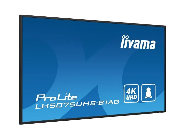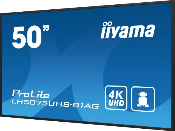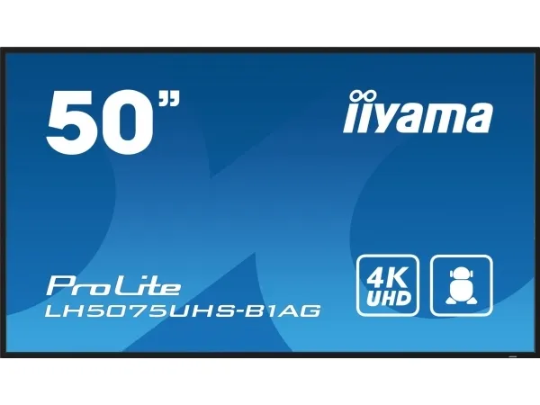 Choose non-stop high performance and reliability with the ideal all-in-one signage solution for mission critical environments. The LH5075UHS from iiyama can be operated in landscape or portrait orientation in continual around the clock environments, 24/7 without any interruption. Its versatility can be adapted to your industry’s display needs. On-board Android 11 OS means you can easily customize the display to your needs and install applications directly to it. The on-board iiSignage² (Content Management System) gives you total control of your messaging and advertising remotely and safely. The SDM Slot provides embedded PC option for total flexibility, security and control, while the FailOver feature ensures your content is always actively displayed through your choice of inputs. The built-in (and removable) WiFi module means this series is ready for remote content delivery using your network. With the EShare app you bring effortless ideation and efficient collaboration in your enterprise or school. You can start sharing wirelessly easier than ever before.iiyama LH5075UHS-B1AG. Product design: Digital signage flat panel. Display diagonal: 125.7 cm (49.5"), Display technology: LCD, Display resolution: 3840 x 2160 pixels, Display brightness: 500 cd/m², HD type: 4K Ultra HD. Wi-Fi. Operating hours (hours/days): 24/7. Operating system installed: Android 11. Product colour: Black