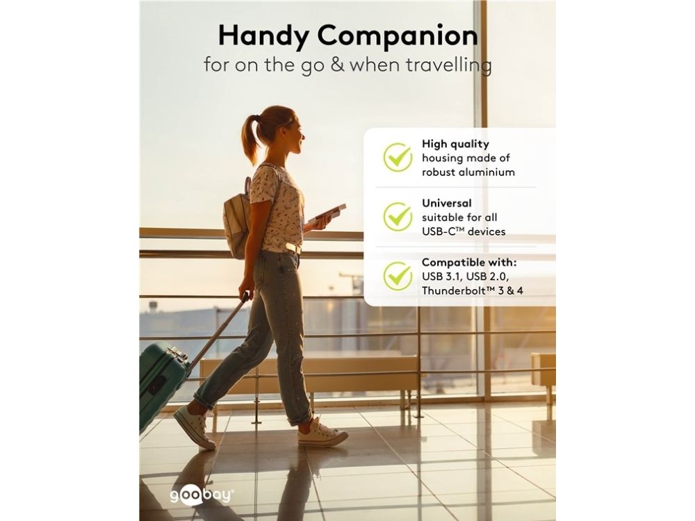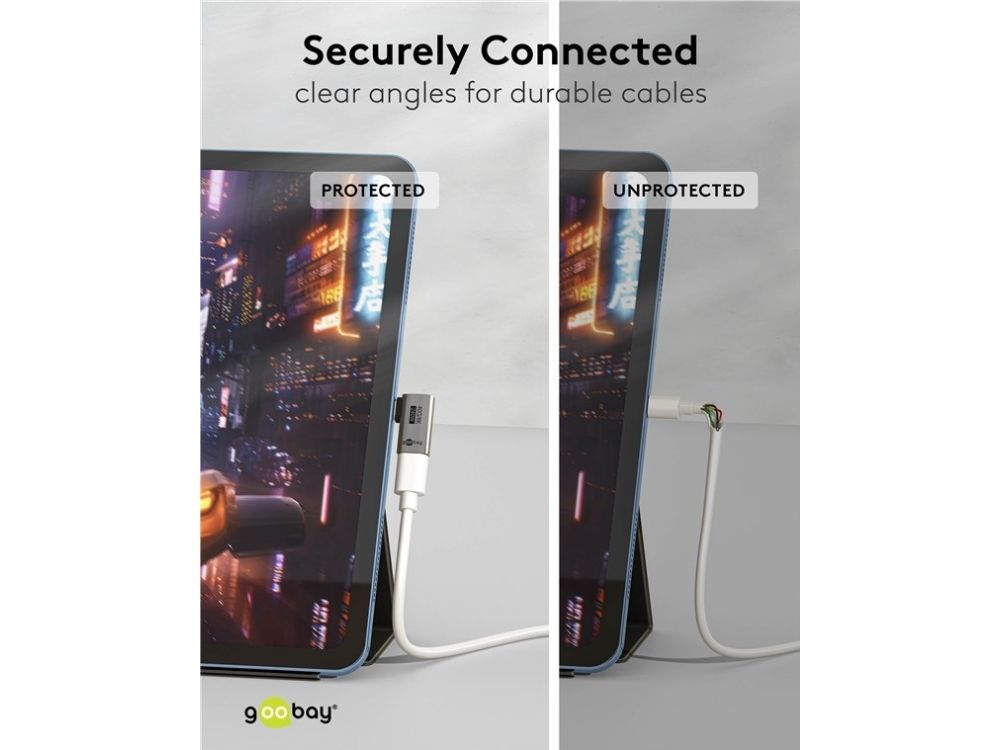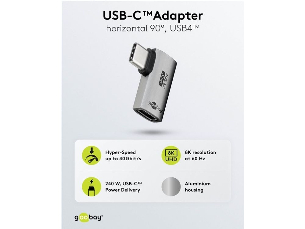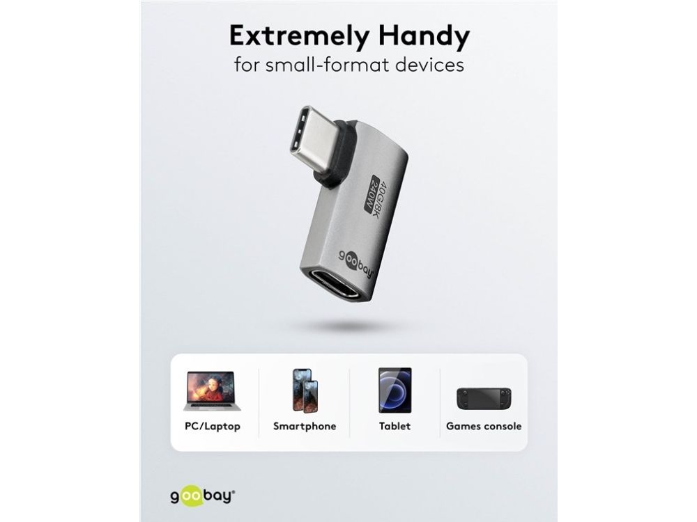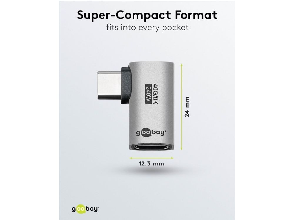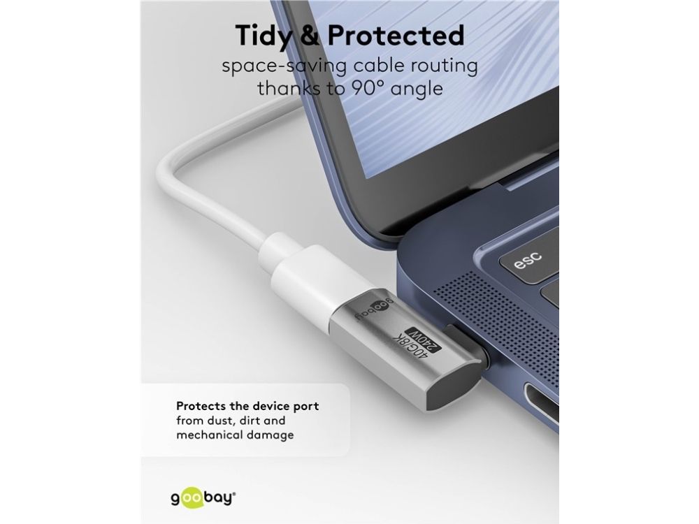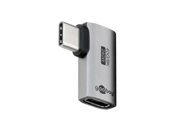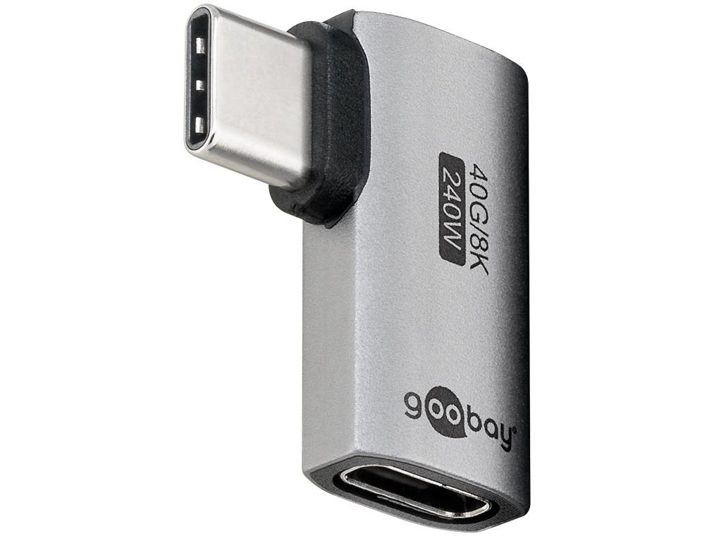 USB-C™ > USB-C™ Durch den 90°-Winkel sorgt der USB-Adapter in L-Form für eine platzsparende Kabelführung auch auf engem Raum und beugt so Kabelbruch vor Besonders praktisch für kleinformatige Geräte wie Tablets, die Nintendo Switch, das Steam Deck oder Smartphones, z. B. Apple iPhone 15 oder Samsung Galaxy Permanent angeschlossen an eine USB-Gerätebuchse, schont der kompakte USB-C™-Stecker den Geräteport bei häufigem Verbinden von Lade- oder Datenkabeln Unterstützt USB4™ und damit ultraschnelle Datenübertragung mit bis zu 40 Gbit/s sowie Ladeleistungen mit bis zu 240 W über Power Delivery (EPR) Ermöglicht gestochen scharfe Videoqualität bis 8K @ 60 Hz und ist kompatibel mit USB 3.1, USB 2.0 sowie Thunderbolt™ 3 und Thunderbolt™ 4 Hochwertiges, robustes Metallgehäuse für eine angenehme Haptik und besondere Langlebigkeit Superkompaktes Format, das in jede Tasche passt und unterwegs und auf Reisen zum praktischen Begleiter wird