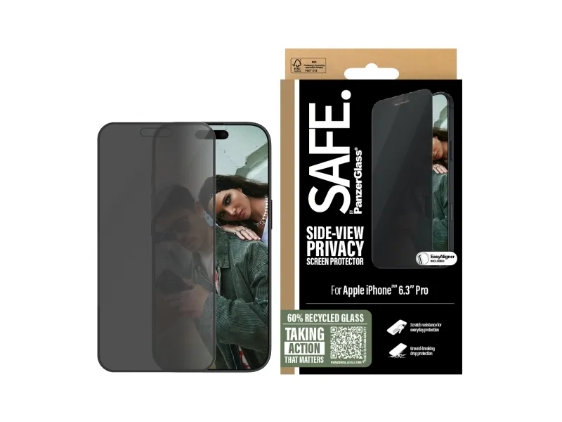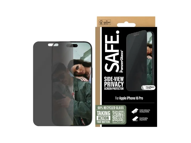 Everyone deserves to be SAFE.! You, your phone, and your private stuff! With this SAFE. by PanzerGlass® privacy screen protector made of 60% recycled glass, your on-screen secrets are safe from nosy neighbours next to you on the train, in the bar or in class. The privacy filter makes the content of your screen virtually invisible to everyone except the person right in front of the screen: YOU! The glass even has a smudge-free coating that reduces traces of fingerprints and grease. And the screen protection? Well, let’s put it this way: You no longer need to worry about dance floor mishaps, selfies gone wrong and your everyday fumbling, dropping and screen cracking!  Can you feel it? Love is in the air. Love for phones and the planet. It’s the new circle of phone life. When you keep your beloved phone SAFE., you can one day pass it on to another phone lover who will love it just as much as you do. Choose SAFE. and give your phone a second, third or fourth life! This is one way of working toward a more sustainable future! Another is to use more sustainable packaging. So, of course, this product comes in a recyclable FSC™-certified box. It should be EASY to be SAFE.! Without hassle, red tape, or unnecessary complexity! This screen protector comes with an EasyAligner that makes installation a piece of cake (seriously!) and to make it even easier, we’ve included step-by-step instructions as well as a QR code for quick access to our online how-to video. And remember: You just need to install the screen protection once! Then you’ll never again fear the sight of your phone tumbling to the ground screen first. This may not happen, but if it does, you’ll regret not having clicked “add to cart”.  No screen protection is worth poor screen performance! That’s why this screen protector comes in Ultra-Wide Fit, meaning it covers the front surface of your phone, providing a complete and crystal-clear view of your screen. It even leaves a little room around the edges for a case from CARE by PanzerGlass®. And if you want to be extra SAFE., combine the screen protector and case with a SAFE. by PanzerGlass® camera lens protector. Keep your phone SAFE.PanzerGlass SAFE. by ® Privacy Screen Protector iPhone 16 Pro | Ultra-Wide Fit. Brand compatibility: Apple, Compatibility: Apple - iPhone 16 Pro. Dry application. Protection features: Scratch resistant, Shock resistant. Privacy filtering function, Material: Tempered glass, Polyethylene terephthalate (PET), Silicone, Product colour: Transparent. Quantity per pack: 1 pc(s)