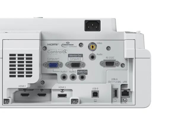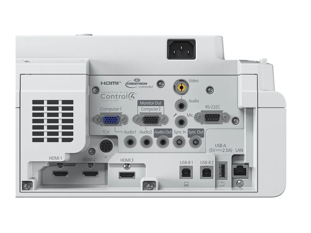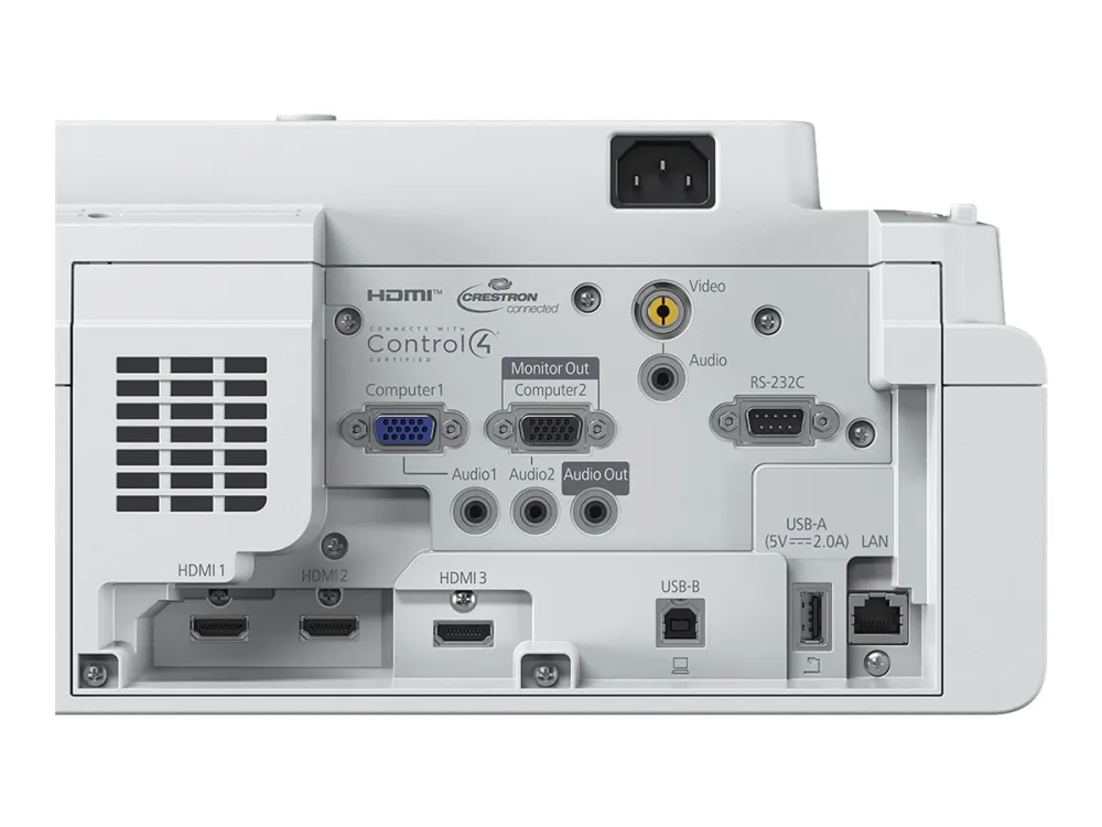 Unlike a flat-panel display, there is no heavy, breakable, glass panel to create disruptive, reflected blind spots from certain angles, and presenters are not subjected to LCD panel direct blue light radiation, believed to damage eyes.Epson EB-760Wi. Projector brightness: 4100 ANSI lumens, Projection technology: 3LCD, Projector native resolution: WXGA (1280x800). Light source type: Laser, Service life of light source: 20000 h, Service life of light source (economic mode): 30000 h. Focus: Manual, Fixed focal length: 3.7 mm, Zoom ratio: 1.35:1. Serial interface type: RS-232C, Service port type: USB Type-B. Ethernet LAN data rates: 10,100 Mbit/s, Wi-Fi standards: 802.11a, 802.11b, 802.11g, Wi-Fi 4 (802.11n), Wi-Fi 5 (802.11ac)
