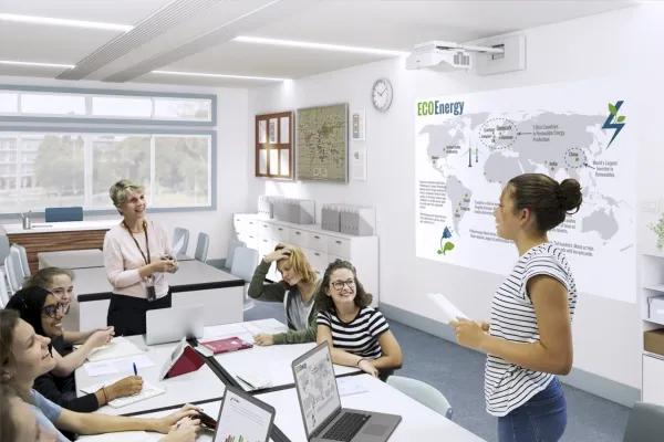 The ultra short throw lens allows safe, discreet positioning above the display, enabling presenters free access to interact without casting shadows.