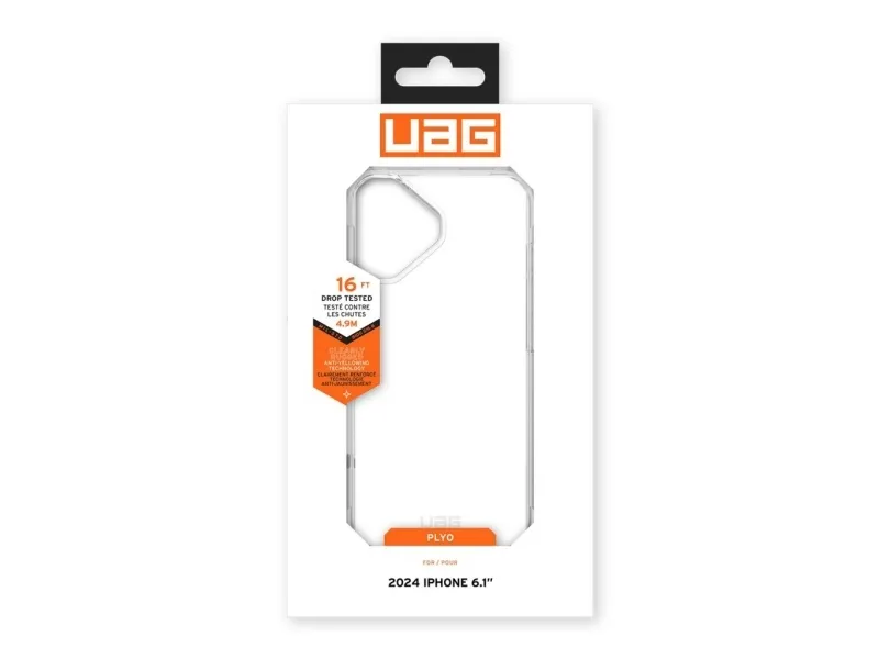 Urban Armor Gear UAG Plyo for iPhone 16 is a slim protective case built for everyday use without adding bulk. It combines a shock-absorbing frame with a durable back to help protect against drops and impacts while keeping wireless charging simple and reliable. 4.8 m drop protection with MIL-SPEC tested durability Lightweight protection with a shock-absorbing TPU frame Anti-yellowing clarity that stays looking clean over time Air-soft cushioned corners and raised screen surround Wireless charging compatible with a secure fit and lanyard anchor points 4.8 m drop protection with MIL-SPEC tested durability Designed to handle real-world drops and impacts the Plyo case has been independently tested for drop protection up to 4.8 meters and meets 3X military drop-test standards (MIL-SPEC 810G-516.6). It?s built to protect your iPhone 16 through daily use commuting travel and more demanding conditions. Lightweight protection with a shock-absorbing TPU frame The case uses a TPU shock-absorbing frame paired with a durable polycarbonate backplate to balance protection and a slim feel. Reinforced TPU bumpers help absorb and disperse impact forces reducing the chance of damage from knocks and drops. Anti-yellowing clarity that stays looking clean over time Built with anti-yellowing technology the clear design is made to maintain its clarity longer. This helps your phone?s original color stay visible while the case continues to look premium with regular use. Air-soft cushioned corners and raised screen surround Air-soft cushioned corners add extra protection where impacts are most likely to happen. A protective screen surround helps reduce direct contact between the screen and flat surfaces when the phone is placed face-down. Wireless charging compatible with a secure fit and lanyard anchor points The case supports wireless charging so you can charge without removing it. Integrated lanyard anchor points add an option for extra carry security and convenience when you want it (lanyard not included). Package includes: Urban Armor Gear UAG Plyo case for iPhone 16 Product specifications: Compatibility: iPhone 16 Materials: TPU shock-absorbing frame with polycarbonate backplate Drop protection: up to 4.8 m Test standard: MIL-SPEC 810G-516.6 (3X military drop-test standards) Wireless charging: compatible Protection features: air-soft cushioned corners protective screen surround scratch-resistant skid pads Clarity feature: anti-yellowing technology Lanyard support: integrated lanyard anchor points (lanyard not included)