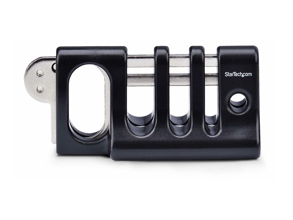 The Peripheral Cable Anchor Lock from StarTech.com is designed to provide a reliable solution for securing your wired peripherals, including keyboards, mice, and notebooks. This security cable anchor offers theft protection, ensuring that devices remain safe and organized while in use. With a desk mountable design and a sturdy blend of plastic and steel materials, this cable lock is durable and practical for maintaining a tidy workspace. Included in the package is a double-sided adhesive strip that allows for installation. The innovative trap lock method prevents unauthorized access, making it an essential tool for both office and home environments. TAA compliance further enhances its appeal, ensuring adherence to quality standards.